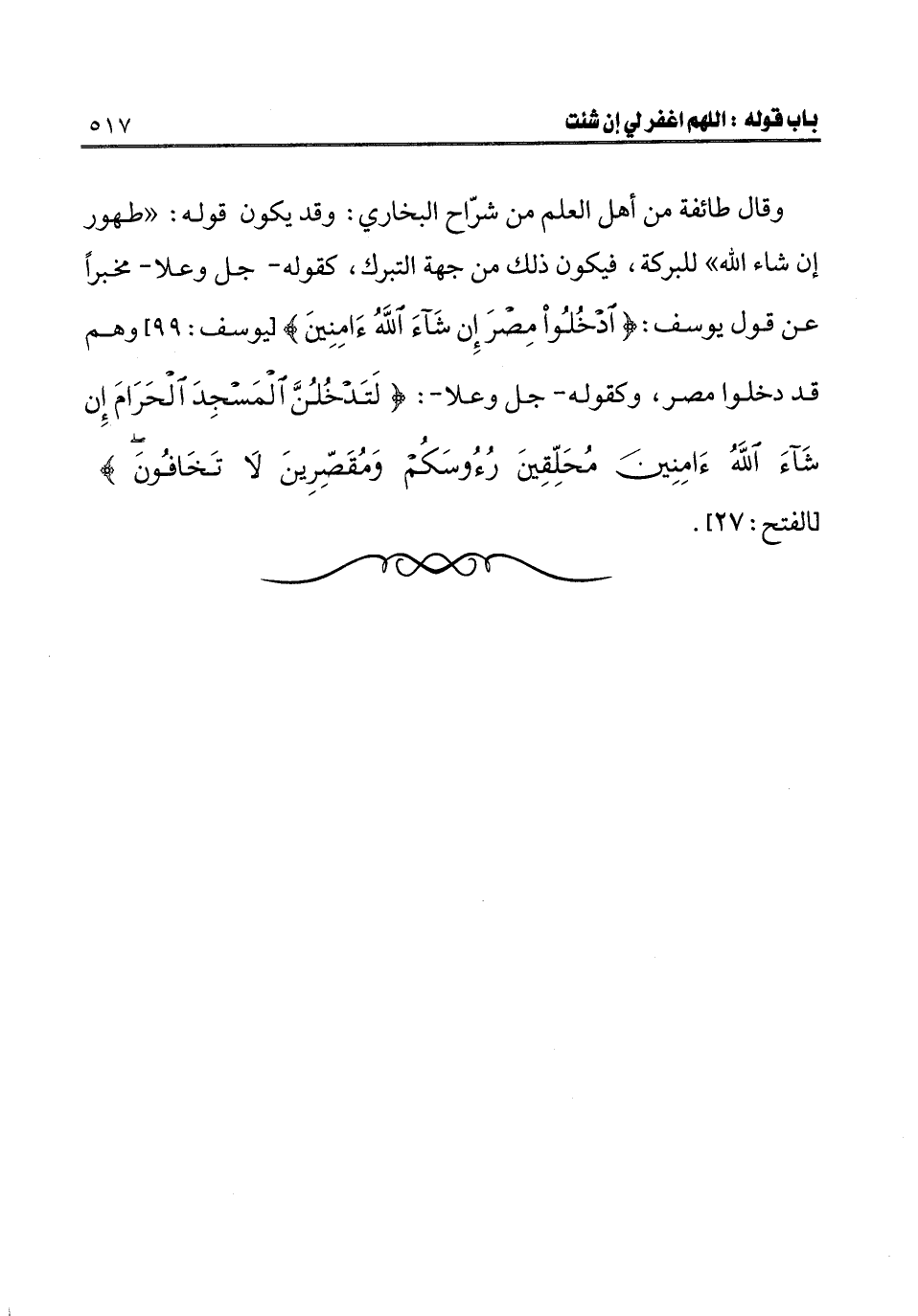 ـــــــــــــــــــــــــــــQوقال طائفة من أهل العلم من شراح البخاري: وقد يكون قوله: «طهور إن شاء الله» للبركة، فيكون ذلك من جهة التبرك، كقوله- جل وعلا- مخبرا عن قول يوسف: {ادْخُلُوا مِصْرَ إِنْ شَاءَ اللَّهُ آمِنِينَ} [يوسف: 99] وهم قد دخلوا مصر، وكقوله- جل وعلا-: {لَتَدْخُلُنَّ الْمَسْجِدَ الْحَرَامَ إِنْ شَاءَ اللَّهُ آمِنِينَ مُحَلِّقِينَ رُءُوسَكُمْ وَمُقَصِّرِينَ لَا تَخَافُونَ} [الفتح: 27] [الفتح: 27] .