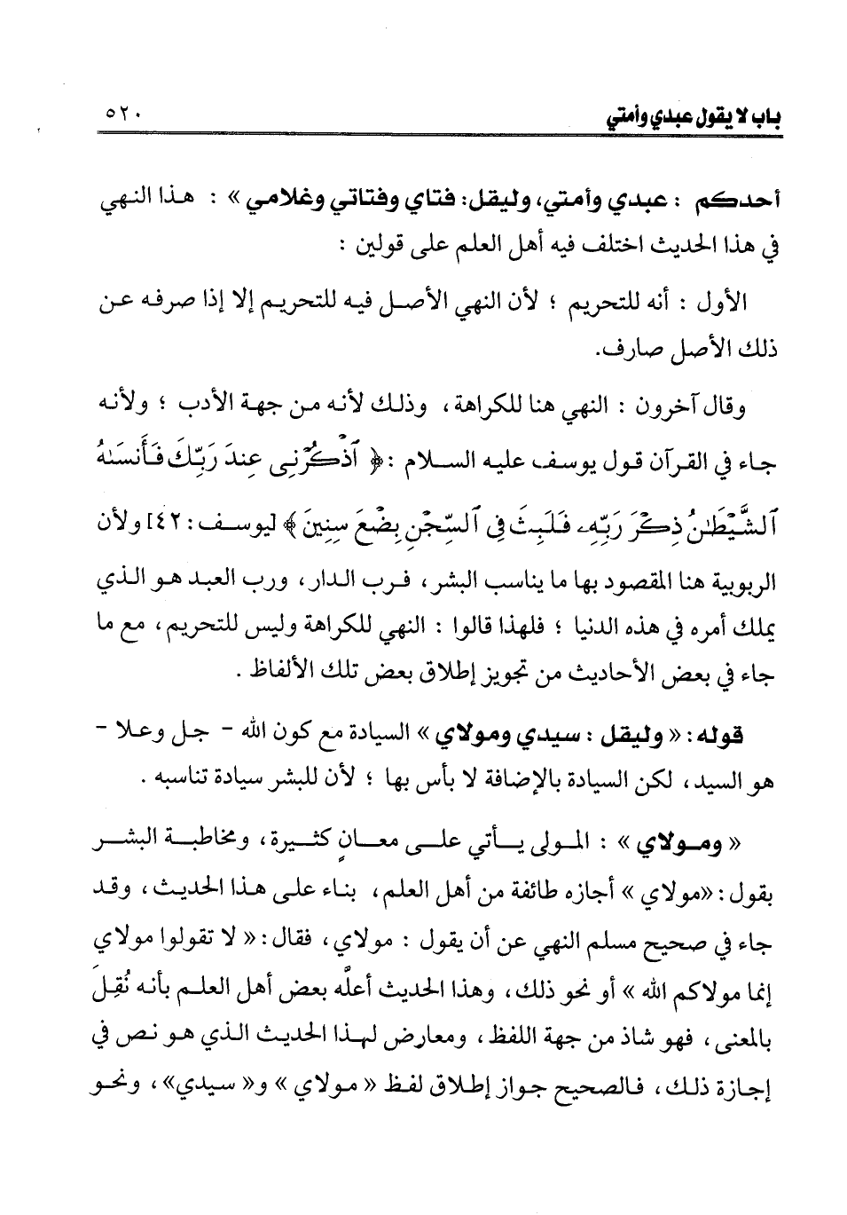 ـــــــــــــــــــــــــــــQأحدكم: عبدي وأمتي، وليقل: فتاي وفتاتي وغلامي» : هذا النهي في هذا الحديث اختلف فيه أهل العلم على قولين: