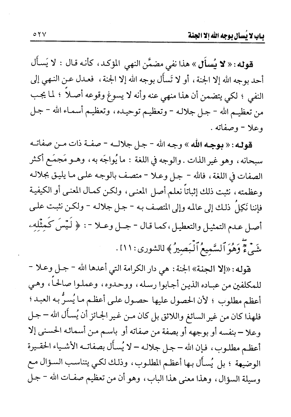 قوله: «إلا الجنة» الجنة: هي دار الكرامة التي أعدها الله- جل وعلا- للمكلفين من عباده الذين أجابوا رسله، ووحدوه، وعملوا صالحا، وهي أعظم مطلوب لأن الحصول عليها حصول على أعظم ما يسر به العبد؛ فلهذا كان من غير السائغ واللائق بل كان من غير الجائز أن يسأل الله- جل وعلا- بنفسه أو بوجهه أو بصفة من صفاته أو باسم من أسمائه الحسنى إلا أعظم مطلوب، فإن الله- جل جلاله- لا يسأل بصفاته الأشياء الحقيرة الوضيعة؛ بل يسأل بها أعظم المطلوب، وذلك لكي يتناسب السؤال مع وسيلة السؤال، وهذا معنى هذا الباب، وهو أن من تعظيم صفات الله- جل