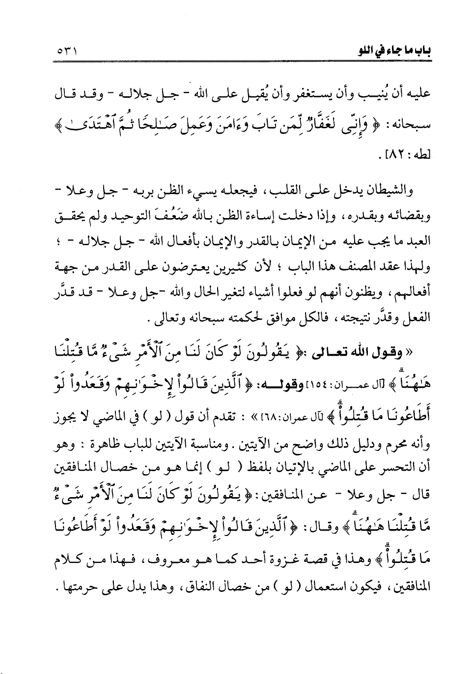 " وقول الله تعالى: {يَقُولُونَ لَوْ كَانَ لَنَا مِنَ الْأَمْرِ شَيْءٌ مَا قُتِلْنَا هَاهُنَا} [آل عمران: 154] [آل عمران: 154] وقوله: {الَّذِينَ قَالُوا لِإِخْوَانِهِمْ وَقَعَدُوا لَوْ أَطَاعُونَا مَا قُتِلُوا} [آل عمران: 168] [آل عمران: 168] ": تقدم أن قول (لو) في الماضي لا يجوز وأنه محرم ودليل ذلك واضح من الآيتين. ومناسبة الآيتين للباب ظاهرة: وهو أن التحسر على الماضي بالإتيان بلفظ (لو) إنما هو من خصال المنافقين قال- جل وعلا- عن المنافقين: {يَقُولُونَ لَوْ كَانَ لَنَا مِنَ الْأَمْرِ شَيْءٌ مَا قُتِلْنَا هَاهُنَا} [آل عمران: 154] وقال: {الَّذِينَ قَالُوا لِإِخْوَانِهِمْ وَقَعَدُوا لَوْ أَطَاعُونَا مَا قُتِلُوا} [آل عمران: 168] وهذا في قصة غزوة أحد كما هو معروف، فهذا من كلام المنافقين، فيكون استعمال (لو) من خصال النفاق، وهذا يدل على حرمتها.