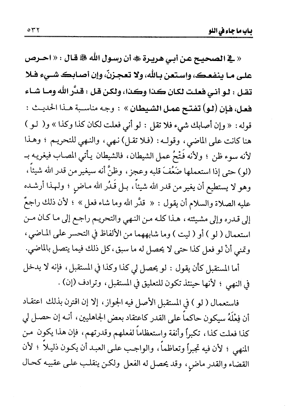 ـــــــــــــــــــــــــــــQفي الصحيح عن أبي هريرة رضي الله عنه أن رسول الله صلى الله عليه وسلم قال: «احرص على ما ينفعك، واستعن بالله، ولا تعجزن، وإن أصابك شيء فلا تقل: لو أني فعلت لكان كذا وكذا، ولكن قل: قدر الله وما شاء فعل، فإن (لو) ، تفتح عمل الشيطان» : وجه مناسبة هذا الحديث: قوله: «وإن أصابك شيء فلا تقل: لو أني فعلت لكان كذا وكذا» و (لو) هنا كانت على الماضي، وقوله: (فلا تقل) نهي، والنهي للتحريم؛ وهذا لأنه سوء ظن؛ ولأنه فتح عمل الشيطان، فالشيطان يأتي المصاب فيغريه بـ (لو) حتى إذا استعملها ضعف قلبه وعجز، وظن أنه سيغير من قدر الله شيئا، وهو لا يستطيع أن يغير من قدر الله شيئا، بل قدر الله ماض؛ ولهذا أرشده عليه الصلاة والسلام أن يقول: «قدر الله وما شاء فعل» ؛ لأن ذلك راجع إلى قدره وإلى مشيئته، هذا كله من النهي والتحريم راجع إلى ما كان من استعمال (لو) أو (ليت) وما شابههما من الألفاظ في التحسر على الماضي، وتمني أن لو فعل كذا حتى لا يحصل له ما سبق، كل ذلك فيما يتصل بالماضي.
