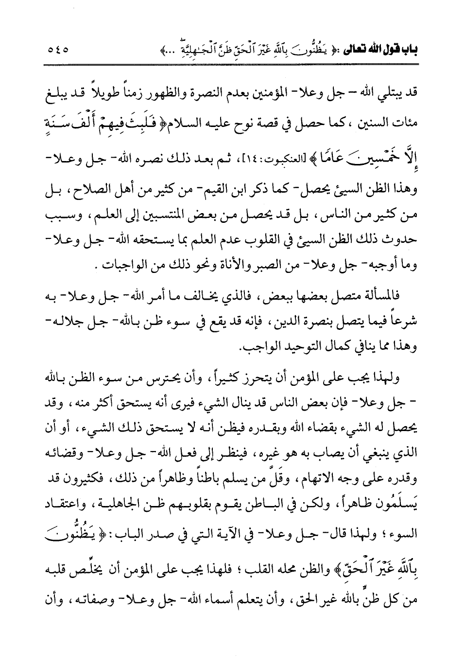 ـــــــــــــــــــــــــــــQقد يبتلي الله - جل وعلا - المؤمنين بعدم النصرة والظهور زمنا طويلا قد يبلغ مئات السنين، كما حصل في قصة نوح عليه السلام: {فَلَبِثَ فِيهِمْ أَلْفَ سَنَةٍ إِلَّا خَمْسِينَ عَامًا} [العنكبوت: 14] [العنكبوت: 14] ، ثم بعد ذلك نصره الله - جل وعلا - وهذا الظن السيئ يحصل - كما ذكر ابن القيم - من كثير من أهل الصلاح، بل من كثير من الناس، بل قد يحصل من بعض المنتسبين إلى العلم، وسبب حدوث ذلك الظن السيئ في القلوب عدم العلم بما يستحقه الله - جل وعلا - وما أوجبه - جل وعلا - من الصبر والأناة، ونحو ذلك من الواجبات.