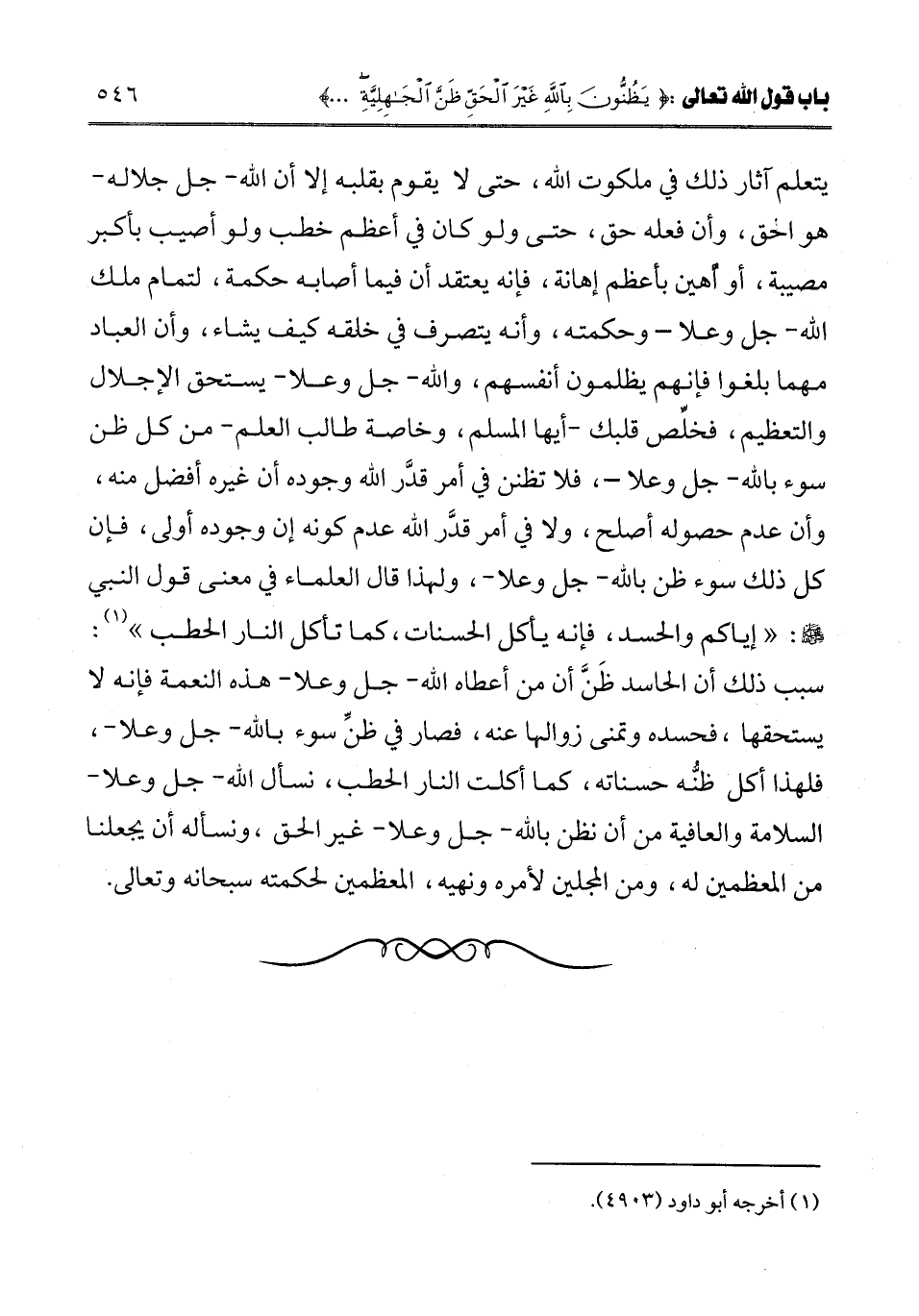 ـــــــــــــــــــــــــــــQيتعلم، آثار ذلك في ملكوت الله، حتى لا يقوم بقلبه إلا أن الله جل جلاله - هو الحق، وأن فعله حق، حتى ولو كان في أعظم خطب، ولو أصيب بأكبر مصيبة، أو أهين بأعظم إهانة، فإنه يعتقد أن فيما أصابه حكمة، لتمام ملك الله - جل وعلا - وحكمته، وأنه يتصرف في خلقه كيف يشاء، وأن العباد مهما بلغوا فإنهم يظلمون أنفسهم، والله - جل وعلا - يستحق الإجلال والتعظيم، فخلص قلبك - أيها المسلم، وخاصة طالب العلم - من كل ظن سوء بالله - جل وعلا -، فلا تظنن في أمر قدر الله وجوده أن غيره أفضل منه، وأن عدم حصوله أصلح، ولا في أمر قدر الله عدم كونه أن وجوده أولى، فإن كل ذلك سوء ظن بالله - جل وعلا -؛ ولهذا قال العلماء في معنى قول النبي - صلى الله عليه وسلم: «إياكم والحسد، فإنه يأكل الحسنات، كما تأكل النار الحطب» (¬1) سبب ذلك أن الحاسد ظن أن من أعطاه الله - جل وعلا - هذه النعمة فإنه لا يستحقها، فحسده وتمنى زوالها عنه، فصار في ظن سوء بالله - جل وعلا - ولهذا أكل ظنه حسناته، كما أكلت النار الحطب، نسأل الله - جل وعلا - السلامة والعافية من أن نظن بالله - جل وعلا - غير الحق، ونسأله أن يجعلنا من المعظمين له، ومن المجلين لأمره ونهيه، المعظمين لحكمته سبحانه وتعالى.
