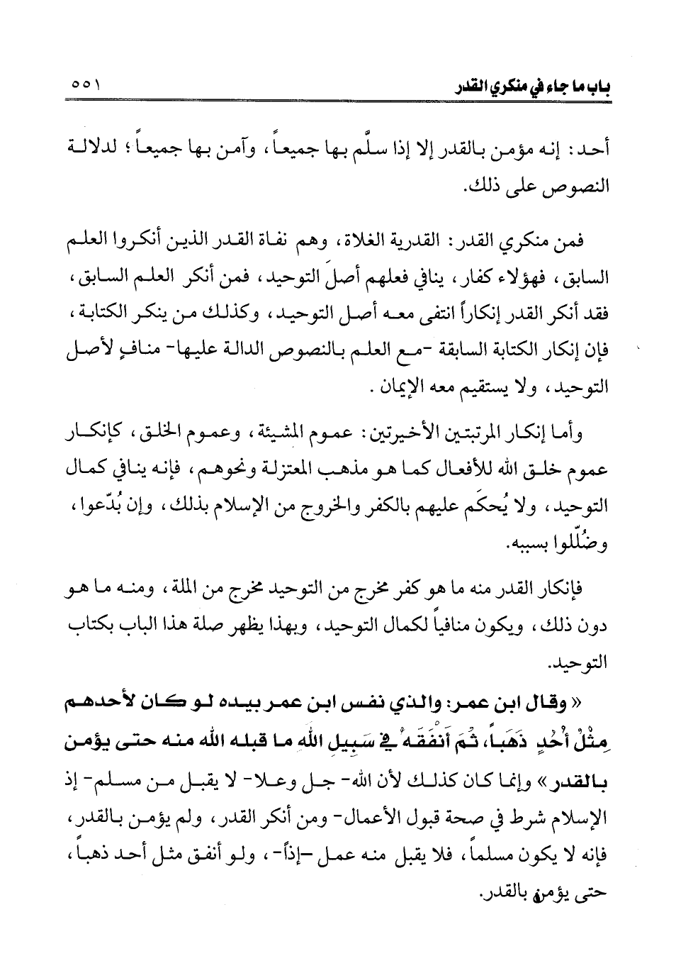 " وقال ابن عمر: والذي نفس ابن عمر بيده لو كان لأحدهم مثل أحد ذهبا، ثم أنفقه في سبيل الله ما قبله الله منه حتى يؤمن بالقدر "، وإنما كان كذلك لأن الله - جل وعلا - لا يقبل من مسلم - إذ الإسلام شرط في صحة قبول الأعمال - ومن أنكر القدر، ولم يؤمن بالقدر، فإنه لا يكون مسلما، فلا يقبل منه عمل - إذا -، ولو أنفق مثل أحد ذهبا، حتى يؤمن بالقدر.