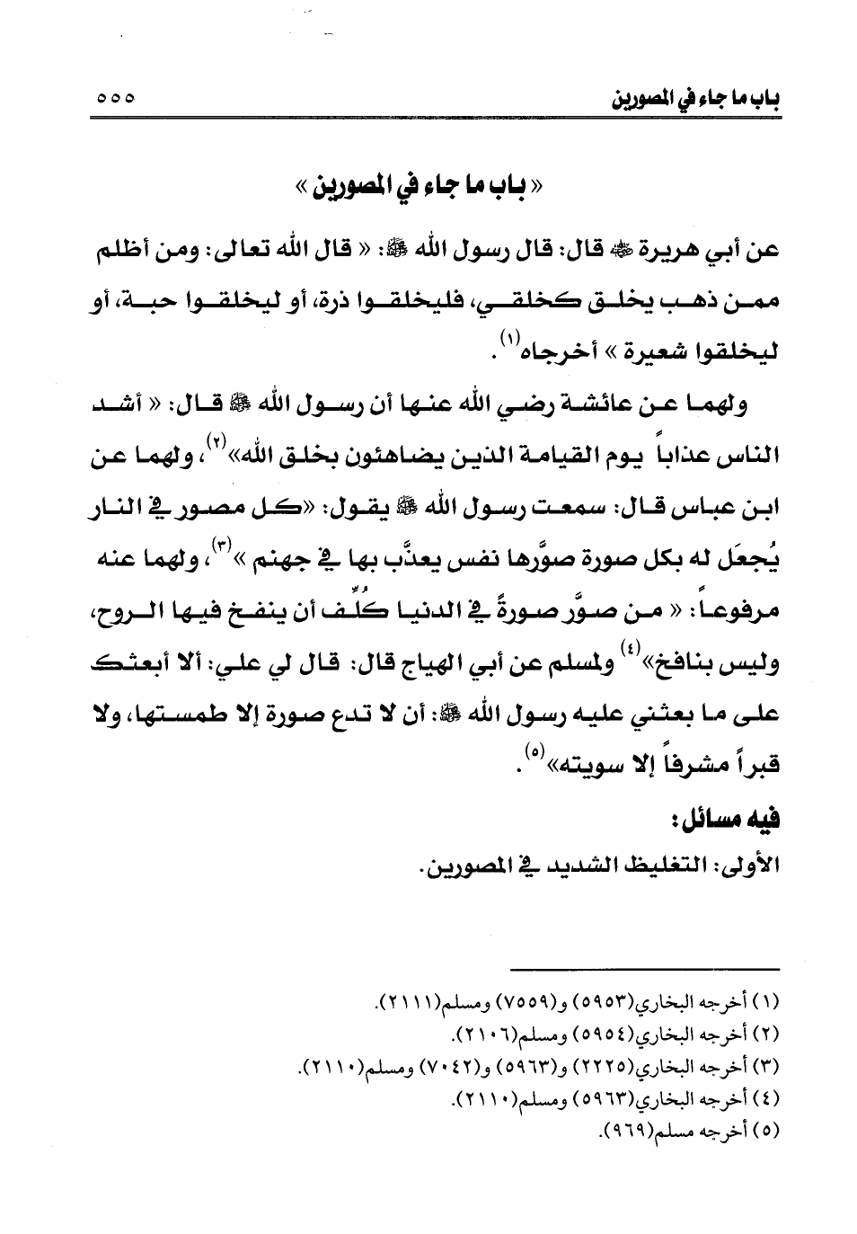 ولهما عن عائشة - رضي الله عنها - أن رسول الله - صلى الله عليه وسلم - قال: «أشد الناس عذابا يوم القيامة الذين يضاهئون بخلق الله» (¬2) ولهما عن ابن عباس قال: سمعت رسول الله - صلى الله عليه وسلم - يقول: «كل مصور في النار يجعل له بكل صورة صورها نفس يعذب بها في جهنم» (¬3) ولهما عنه مرفوعا: «من صور صورة في الدنيا كلف أن ينفخ فيها الروح، وليس بنافخ» (¬4) . ولمسلم عن أبي الهياج قال: قال لي علي: ألا أبعثك على ما بعثني عليه رسول الله - صلى الله عليه وسلم: «أن لا تدع صورة إلا طمستها، ولا قبرا مشرفا إلا سويته» (¬5) .