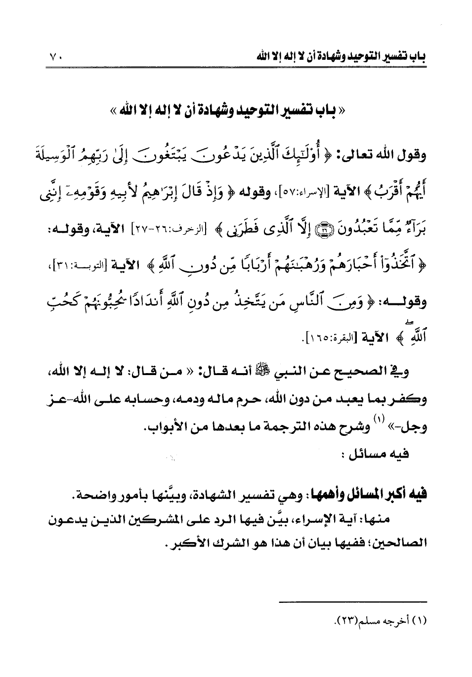 " باب تفسير التوحيد وشهادة أن لا إله إلا الله " وقول الله تعالى: {أُولَئِكَ الَّذِينَ يَدْعُونَ يَبْتَغُونَ إِلَى رَبِّهِمُ الْوَسِيلَةَ أَيُّهُمْ أَقْرَبُ} [الإسراء: 57] الآية [الإسراء: 57] ، وقوله {وَإِذْ قَالَ إِبْرَاهِيمُ لأَبِيهِ وَقَوْمِهِ إِنَّنِي بَرَاءٌ مِمَّا تَعْبُدُونَ - إِلا الَّذِي فَطَرَنِي} [الزخرف: 26 - 27] [الزخرف: 26 - 27] الآية، وقوله: {اتَّخَذُوا أَحْبَارَهُمْ وَرُهْبَانَهُمْ أَرْبَابًا مِنْ دُونِ اللَّهِ} [التوبة: 31] الآية [التوبة: 31] وقوله: {وَمِنَ النَّاسِ مَنْ يَتَّخِذُ مِنْ دُونِ اللَّهِ أَنْدَادًا يُحِبُّونَهُمْ كَحُبِّ اللَّهِ} [البقرة: 165] الآية [البقرة: 165] .