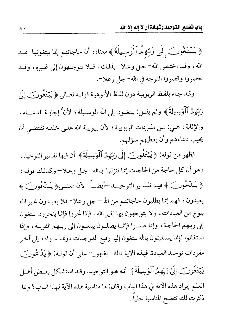 فظهروا من قوله: {يَبْتَغُونَ إِلَى رَبِّهِمُ الْوَسِيلَةَ} [الإسراء: 57] أن فيها تفسير التوحيد، وهو أن كل حاجة من الحاجات إنما تنزلها بالله - جل وعلا - وكذلك قوله: يَدْعُونَ فيه تفسير التوحيد - أيضا - لأن معنى يَدْعُونَ يعبدون؛ فهم إنما يطلبون حاجتهم من الله - جل وعلا - فلا يعبدون غير الله بنوع من العبادات، ولا يتوجهون بها لغير الله، فإذا نحروا فإنما ينحرون يبتغون إلى ربهم الحاجة، وإذا صلوا فإنما يصلون يبتغون إلى ربهم القربة، وإذا استغاثوا فإنما يستغيثون بالله يبتغون إليه رفيع الدرجات دونما سواه، إلى آخر مفردات توحيد العبادة. فهذه الآية دالة - بظهور - على أن قوله: {يَدْعُونَ يَبْتَغُونَ إِلَى رَبِّهِمُ الْوَسِيلَةَ} [الإسراء: 57] أنه هو التوحيد. وقد استشكل بعض أهل العلم إيراد هذه الآية في الباب وقال: ما مناسبة هذه الآية لهذا الباب؟ وبما ذكرت لك تتضح المناسبة جليا.
