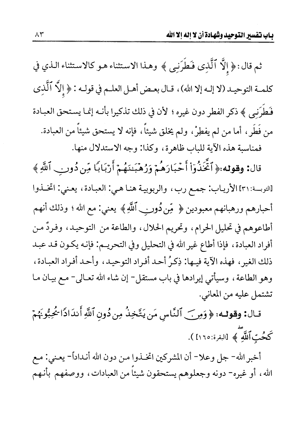 قال: وقوله: {اتَّخَذُوا أَحْبَارَهُمْ وَرُهْبَانَهُمْ أَرْبَابًا مِنْ دُونِ اللَّهِ} [التوبة: 31] [التوبة: 31] الأرباب: جمع رب، والربوبية هنا هي: العبادة، يعني: اتخذوا أحبارهم ورهبانهم معبودين مِنْ دُونِ اللَّهِ يعني: مع الله؛ وذلك أنهم أطاعوهم في تحليل الحرام، وتحريم الحلال، والطاعة من التوحيد، وفردٌ من أفراد العبادة، فإذا أطاع غير الله في التحليل وفي التحريم: فإنه يكون قد عبد ذلك الغير، فهذه الآية فيها: ذِكْرُ أحد أفراد التوحيد، وأحد أفراد العبادة، وهو الطاعة، وسيأتي إيرادها في باب مستقل - إن شاء الله تعالى - مع بيان ما تشتمل عليه من المعاني.