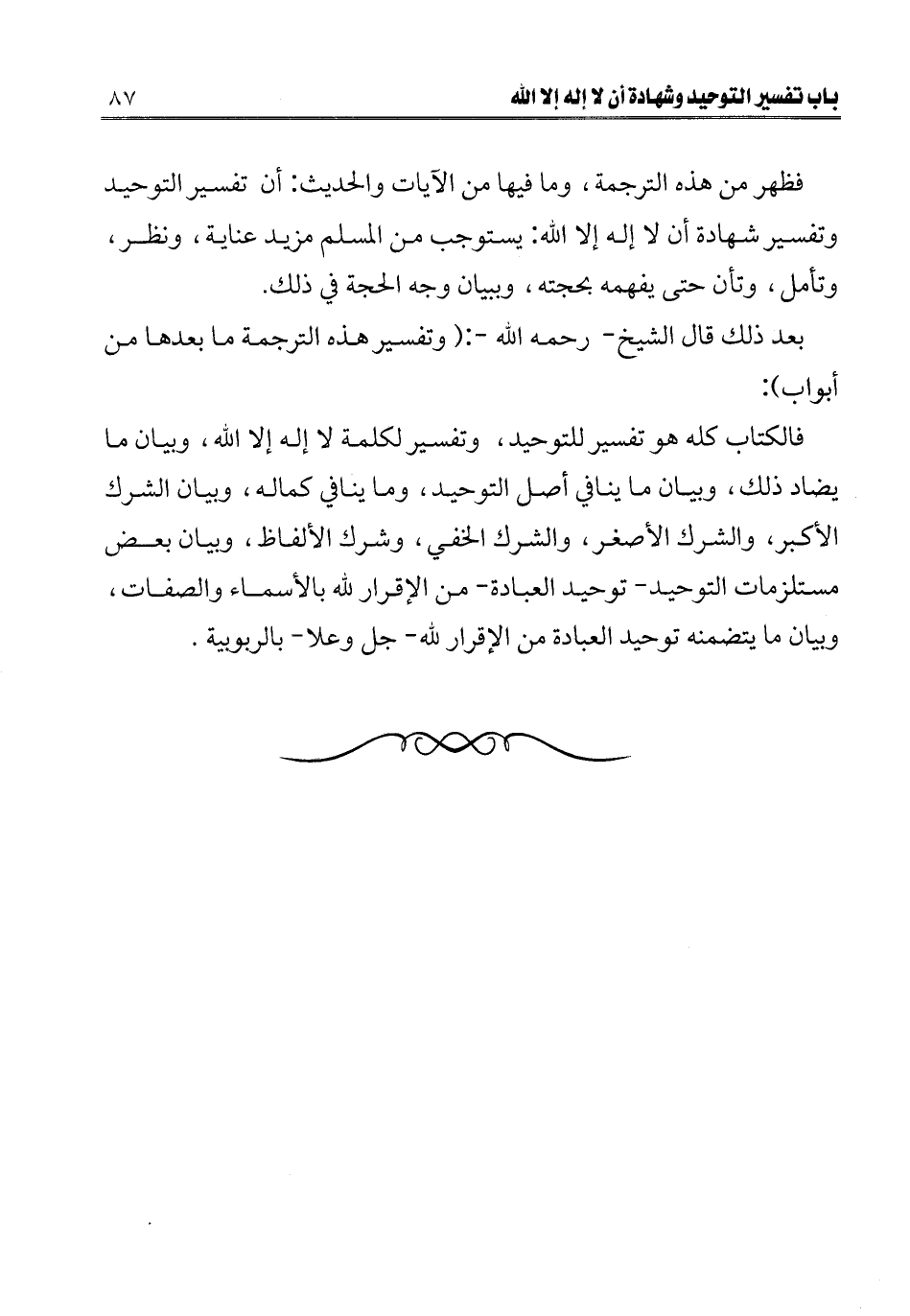 ـــــــــــــــــــــــــــــQفظهر من هذه الترجمة، وما فيها من الآيات والحديث: أن تفسير التوحيد وتفسير شهادة أن لا إله إلا الله: يستوجب من المسلم مزيد عناية، ونظر، وتأمل، وتأنٍّ حتى يفهمه بحجته، وببيان وجه الحجة في ذلك.