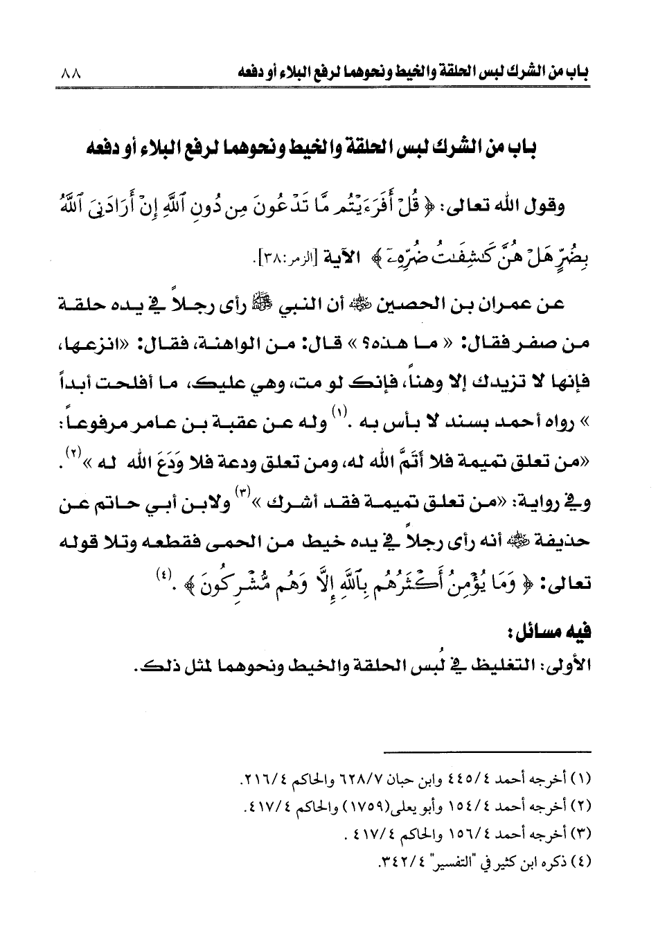 عن عمران بن الحصين رضي الله عنه «أن النبي صلى الله عليه وسلم رأى رجلا في يده حلقة من صفر فقال: " ما هذه؟ " قال: من الواهنة، فقال: " انزعها، فإنها لا تزيدك إلا وهنا، فإنك لو مت، وهي عليك، ما أفلحت أبدا» رواه أحمد بسند لا بأس به (¬1) وله عن عقبة بن عامر مرفوعا: «من تعلق تميمة فلا أتَمَّ الله له، ومن تعلق ودعة فلا وَدَعَ الله له» (¬2) وفي رواية: «من تعلق تميمة فقد أشرك» (¬3) ولابن أبي حاتم عن حذيفة رضي الله عنه أنه رأى رجلا في يده خيط من الحمى فقطعه وتلا قوله تعالى: {وَمَا يُؤْمِنُ أَكْثَرُهُمْ بِاللَّهِ إِلَّا وَهُمْ مُشْرِكُونَ} [يوسف: 106] (¬4) .