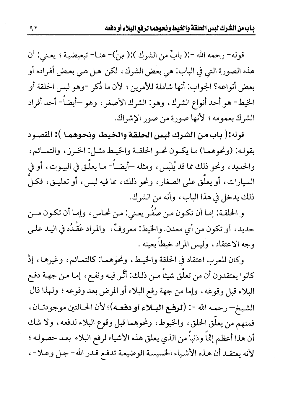 وكان للعرب اعتقاد في الحلقة والخيط، ونحوهما: كالتمائم، وغيرها، إذ كانوا يعتقدون أن من تعلّق شيئا من ذلك: أثر فيه ونفع، إما من جهة دفع البلاء قبل وقوعه، وإما من جهة رفع البلاء أو المرض بعد وقوعه؛ ولهذا قال الشيخ - رحمه الله -: (لرفع البلاء أو دفعه) ؛ لأن الحالتين موجودتان، فمنهم من يعلّق الحلق، والخيوط، ونحوهما قبل وقوع البلاء لدفعه، ولا شك أن هذا أعظم إثما وذنبا من الذي يعلّق هذه الأشياء لرفع البلاء بعد حصوله؛ لأنه يعتقد أن هذه الأشياء الخسيسة الوضعية تدفع قدر الله - جل وعلا -،
