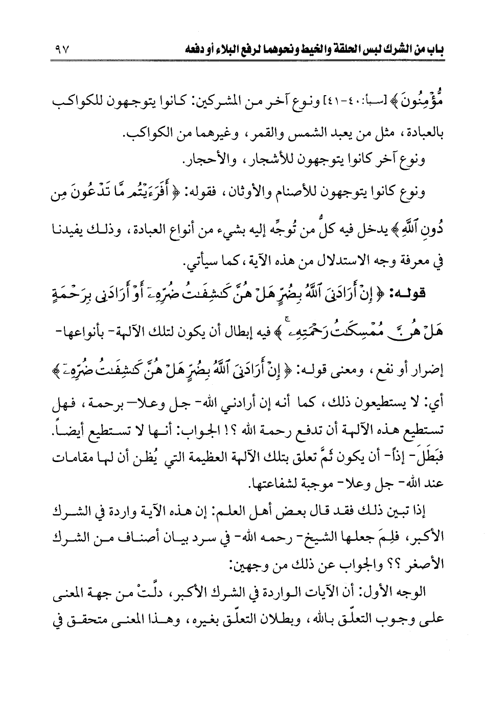 إذا تبين ذلك فقد قال بعض أهل العلم: إن هذه الآية واردة في الشرك الأكبر، فَلِمَ جعلها الشيخ - رحمه الله - في سرد بيان أصناف من الشرك الأصغر؟؟ والجواب عن ذلك من وجهين: