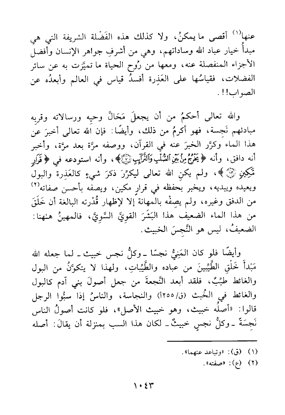 والله تعالى أحكم من أن يجعل محال وحيه ورسالاته وقربه مبادئهم نجسه فهو أكرم من ذلك وأيضا فإن الله تعالى أخبر عنه هذا الماء وكرر الخبر عنه في القرآن ووصفه مرة بعد مرة وأخبر أنه دافق يخرج من بين الصلب والترائب وأنه استودعه في قرار مكين ولم يكن الله تعالى ليكرر ذكر شيء كالعذرة والبول ويعيده ويبديه ويخبر بحفظه في قرار مكين ويصفه بأحسن صفاته من الدفق وغيره ولم يصفه بالمهانة إلا لإظهار قدرته البالغة أنه خلق من هذا الماء الضعيف هذا البشر القوي السوي فالمهين ههنا الضعيف ليس هو النجس الخبيث