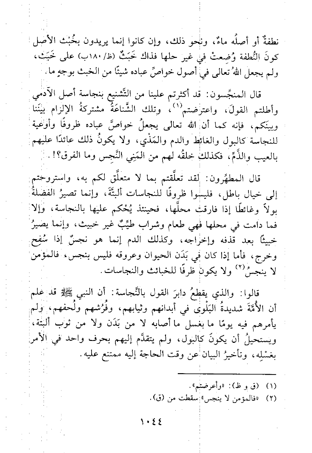 قال المنجسون قد أكثرتم علينا من التشنيع بنجاسة أصل الآدمي وأطلتم القول وأغرضتم وتلك الشناعة مشتركة الإلزام بيننا وبينكم فإنه كما أن الله يجعل خواص عباده ظروفا وأوعية للنجاسة كالبول والغائظ والدم والمذي ولا يكون ذلك عائدا عليهم بالعيب والذم فكذلك خلقه لهم من المني النجس وما الفرق