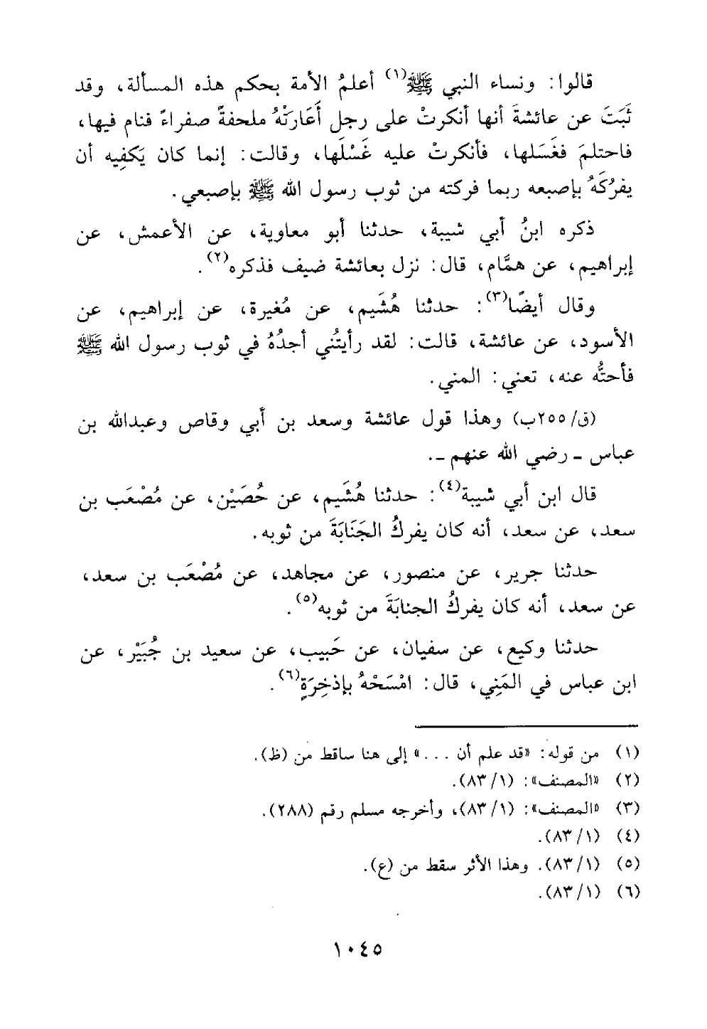 حدثنا أبو معاوية عن الأعمش عن إبراهيم عن همام قال نزل بعائشة ضيف فذكره وقال أيضا حدثنا هشيم عن مغيرة عن إبراهيم عن الأسود عن عائشة قالت لقد رأيتني أجده في ثوب رسول الله عنه تعنى المني // رواه مسلم والنسائي وغيرهم // وهذا قول عائشة وسعد ابن أبي وقاص وعبد الله بن عباس قال ابن أبي شيبة ثنا هشيم عن حصين عن مصعب بن