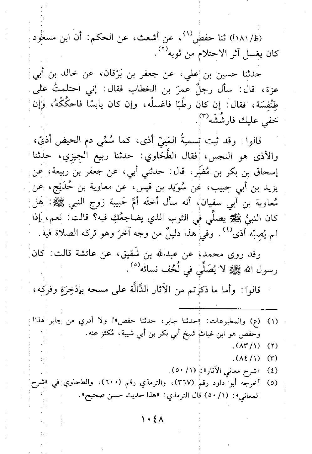 ثنا حسين بن علي عن جعفر بن برقان عن خالد بن أبي عزة قال سأل رجل عمر ابن الخطاب فقال إني احتلمت على طنفسة فقال إن كان رطبا فاغسله وإن كان يابسا فاحككه وإن خفي عليك فارششه قالوا وقد ثبت تسمية المني اذي كما سمى دم الحيض أذى والأذى هو النجس فقال الطحاوي ثنا ربيع الحيرى ثنا إسحاق
