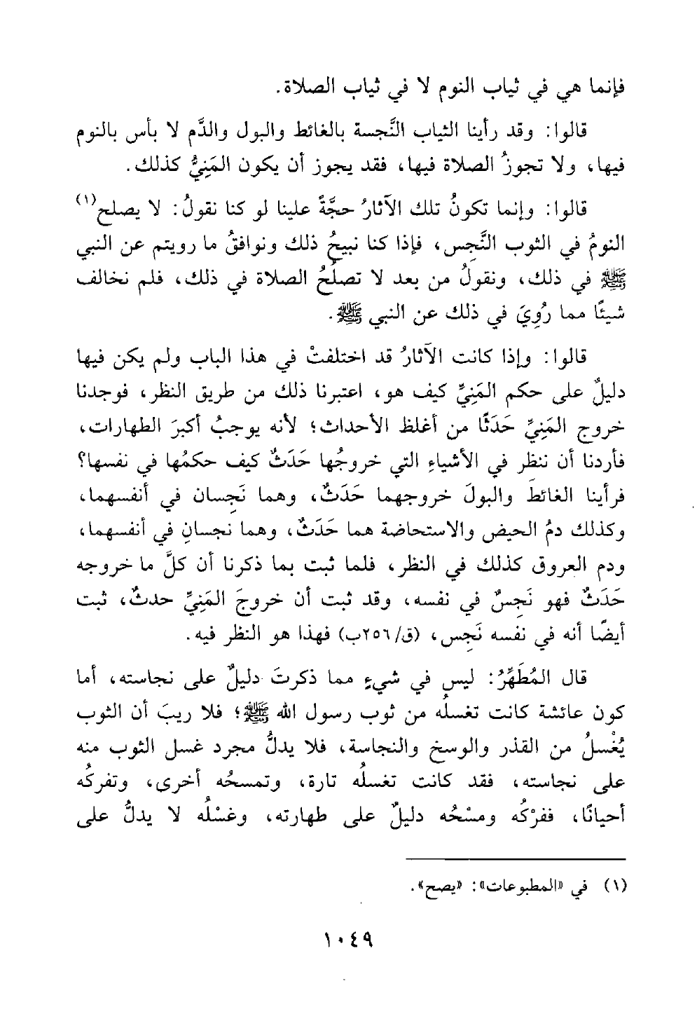قالوا وقد رأينا الثياب النجسة بالغائط والبول والدم لا بأس بالنوم فيها ولا تجوز الصلاة فيها فقد يجوز أن يكون المني كذلك قالوا وإنما تكون تلك الآثار حجة علينا لو كنا نقول لا يصح النوم في الثوب النجس فإذا كنا نبيح ذلك ونوافق ما رويتم ما رويتهم عن النبي ذلك ونقول من بعد لا تصلح الصلاة في ذلك فلم يخالف شيئا مما روى في ذلك عن النبي