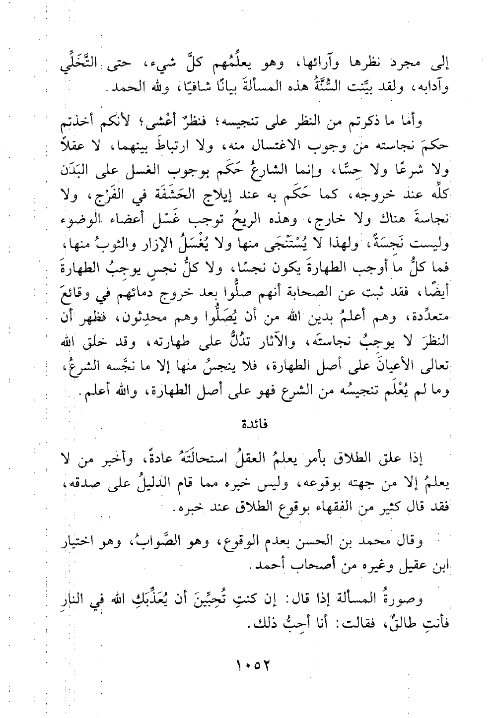 وأما ما ذكرتم من النظر على تنجيسه فنظر أعشى لأنكم أخذتم حكم نجاسته من وجوب الاغتسال منه ولا ارتباط بينهما لا عقلا ولا شرعا ولا حسا وإنما الشارع حكم بوجوب الغسل علىالبدن كله عند خروجه كما حكم به عند إيلاج الحشفة في الفرج ولا نجاسة هناك ولا خارج وهذه الريح توجب غسل أعضاء الوضوء وليست نجسه ولهذا لا يستنجي منها ولا يغسل الإزار والثوب منها فما كل ما أوجب الطهارة يكون نجسا ولا كل نجس يوجب الطهارة أيضا فقد ثبت عن الصحابة أنهم صلوا بعد خروج دمائهم في وقائع متعددة وهم أعلم بدين الله من أن يصلوا وهم محدثون فظهر ان النظر لا يوجب نجاسته والآثار تدل على طهارته وقد خلق الله الأعيان على أصل الطهارة فلا ينجس منها إلا ما نجسه الشرع وما لم يرد تنجيسه من الشرع فهو على أصل الطهارة والله أعلم فائدة تعليق الطلاق على أمر