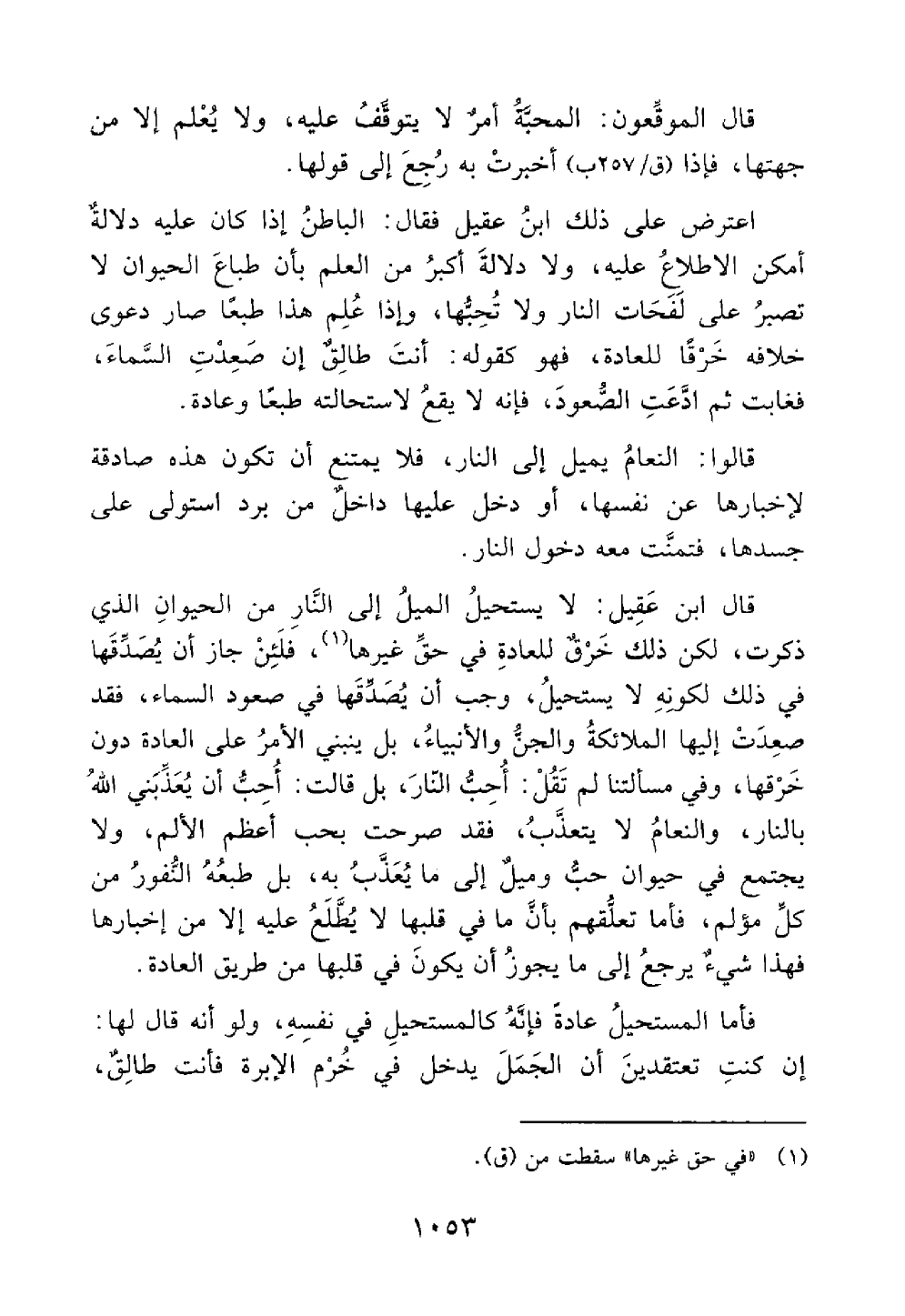 قال ابن عقيل لا يستحيل الميل إلى النار من الحيوان الذي ذكرت لكن ذلك خرق للعادة في حق غيرها فلئن جاز أن يصدقها في ذلك لكونه لا يستحيل وجب أن يصدقها في صعود السماء فقد صعدت إليها الملائكة والجن والأنبياء بل يبنى الأمر على العادة دون خرقها وفي مسألتنا لم تقل أحب النار بل قالت احب ان يعذبني الله بالنار والنعام لا يتعذب فقد صرحت بحب أعظم الألم ولم يجتمع في حيوان حب وميل إلى ما يعذب به فقد صرحت بحب أعظم الألم ولم يجتمع في حيوان حب وميل إلى ما يعذب به بل طبعه النفور من كل مؤلم فأما تعلقهم بأن ما في قلبها لا يطلع عليه إلا من إخبارها فهذا شيء يرجع إلى ما يجوز أن يكون في قلبها من طريق العادة