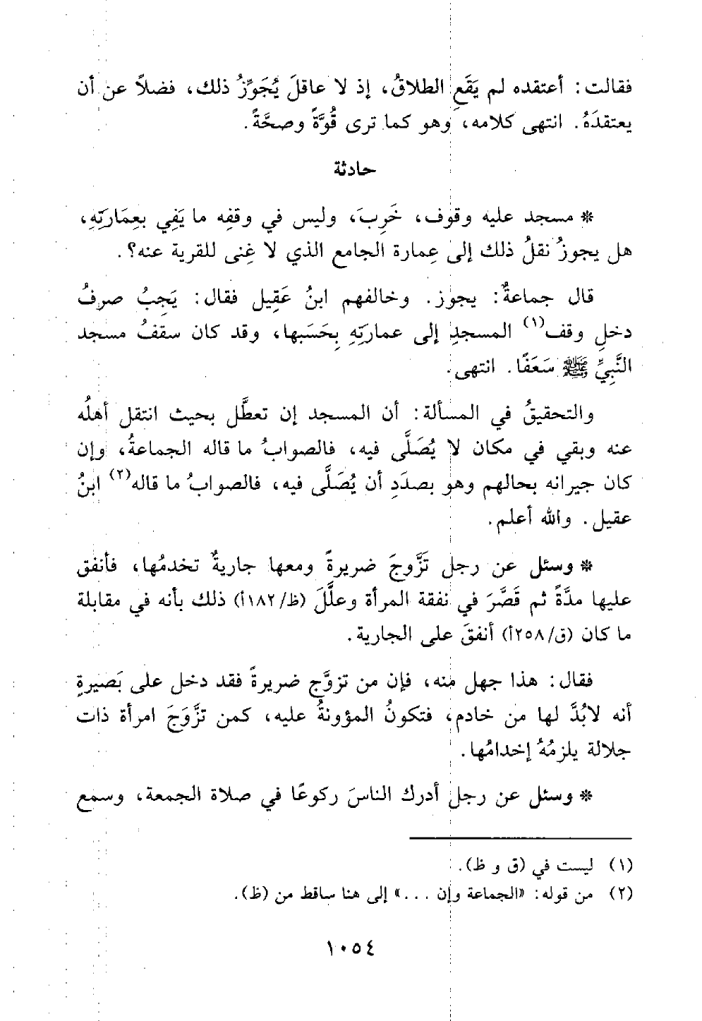 وسئل عن رجل تزوج ضريرة ومعها جارية تخدمها فأنفق عليها مدة ثم قصر في النفقة وعلل ذلك بأنه في مقابلة ما كان أنفق على الجارية فقال هذا فإن من تزوج ضريرة فقد دخل على بصيرة أنه لا بد لها من خادم فتكون المؤونة عليه كمن تزوج امرأة ذات جلالة يلزمه إخدامها