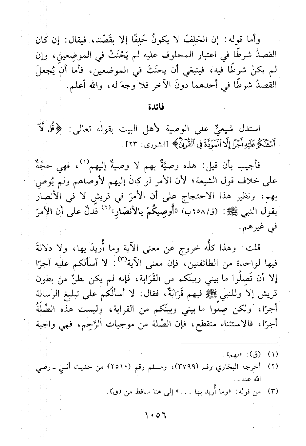 استدل شيعي على الوصية لأهل البيت بقوله تعالى قل لا أسألكم عليه أجرا إلا المودة في القربى فأجيب بأن قيل هذه وصية بهم لا وصية إليهم فهي حجة على خلاف قول الشيعة لأن الأمر لو كان إليهم لأوصاهم ولم يوص بهم ونظير هذا الاحتجاج على أن الأمر في قريش لا في الأنصار بقول النبي أوصيكم بالأنصار // رواه البخاري ومسلم والترمذي // فدل على أن الأمر في غيرهم