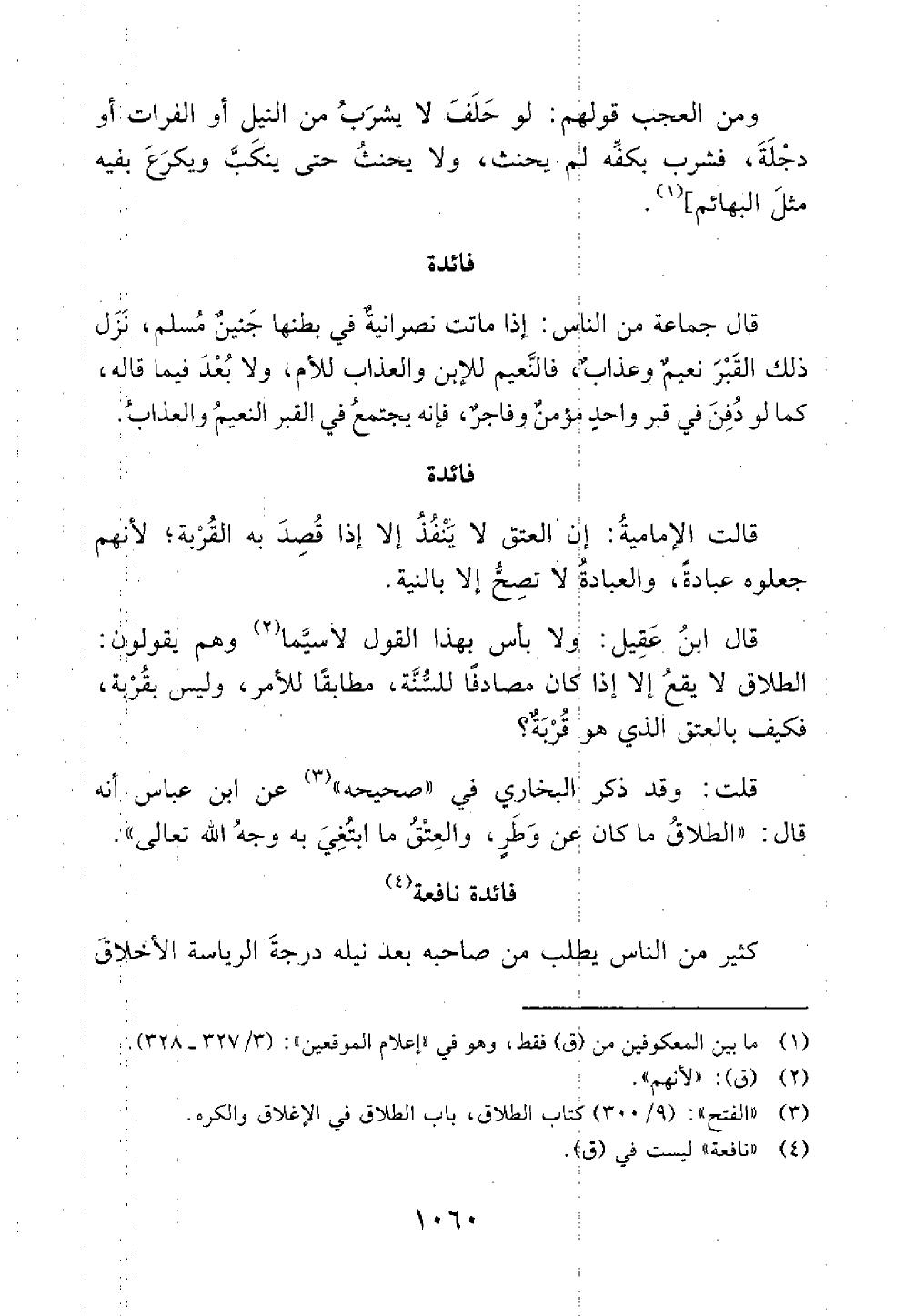 قال ابن عقيل ولا بأس بهذا القول لا سيما وهم يقولون الطلاق لا يقع إلا إذا كان مصادقا للسنة مطابقا للأمر وليس بقربة فكيف بالعتق الذي هو قربة قلت وقد ذكر البخاري في صحيحه عن ابن عباس أنه قال الطلاق ما كان عن وطر والعتق ما ابتغى به وجه الله فائدة خطاب الرؤساء باللين