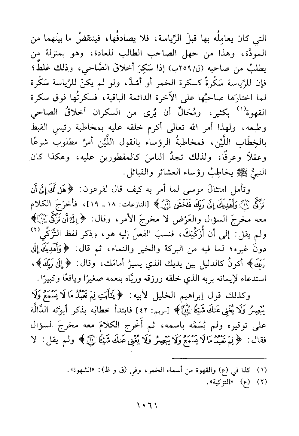 التي كان يعامله بها قبل الرياسة فلا يصادفها فينتقض ما بينهما من المودة وهذا من جهل الصاحب الطالب للعادة وهو بمنزلة من يطلب من صاحبه إذا سكر أخلاق الصاحي وذلك غلط فإن الرياسه سكرة كسكرة الخمر أو أشد ولو لم يكن للرياسة سكرة لما اختارها صاحبها على الآخرة الدائمة الباقية فسكرتها فوق سكرة القهوة بكثير ومحال أن يرى من السكران أخلاق الصاحي وطبعه ولهذا أمر الله تعالى أكرم خلقه عليه بمخاطبة رئيس القبط بالخطاب اللين فمخاطبة الرؤساء بالقول اللين أمر مطلوب شرعا وعقلا وعرفا ولذلك تجد الناس كالمفطورين عليه وهكذا كان النبي رؤساء العشائر والقبائل وتأمل امتثال موسى لما أمر به كيف قال لفرعون هل لك إلى أن تزكى وأهديك إلى ربك فتخشى فأخرج الكلام معه مجرج السؤال والعرض لا مخرج الأمر وقال إلى أن تزكى ولم يقل إلى أن أزكيك فنسب الفعل إليه هو وذكر لفظ التزكي دون غيره لما فيه من البركة والخير والنماء ثم قال وأهديك إلى ربك أكون كالدليل بين يديك الذي يسير أمامك وقال الى ربك استدعاء لأيمانه بربه الذي خلقه ورزقه ورباه بنعمه صغيرا ويافعا وكبيرا