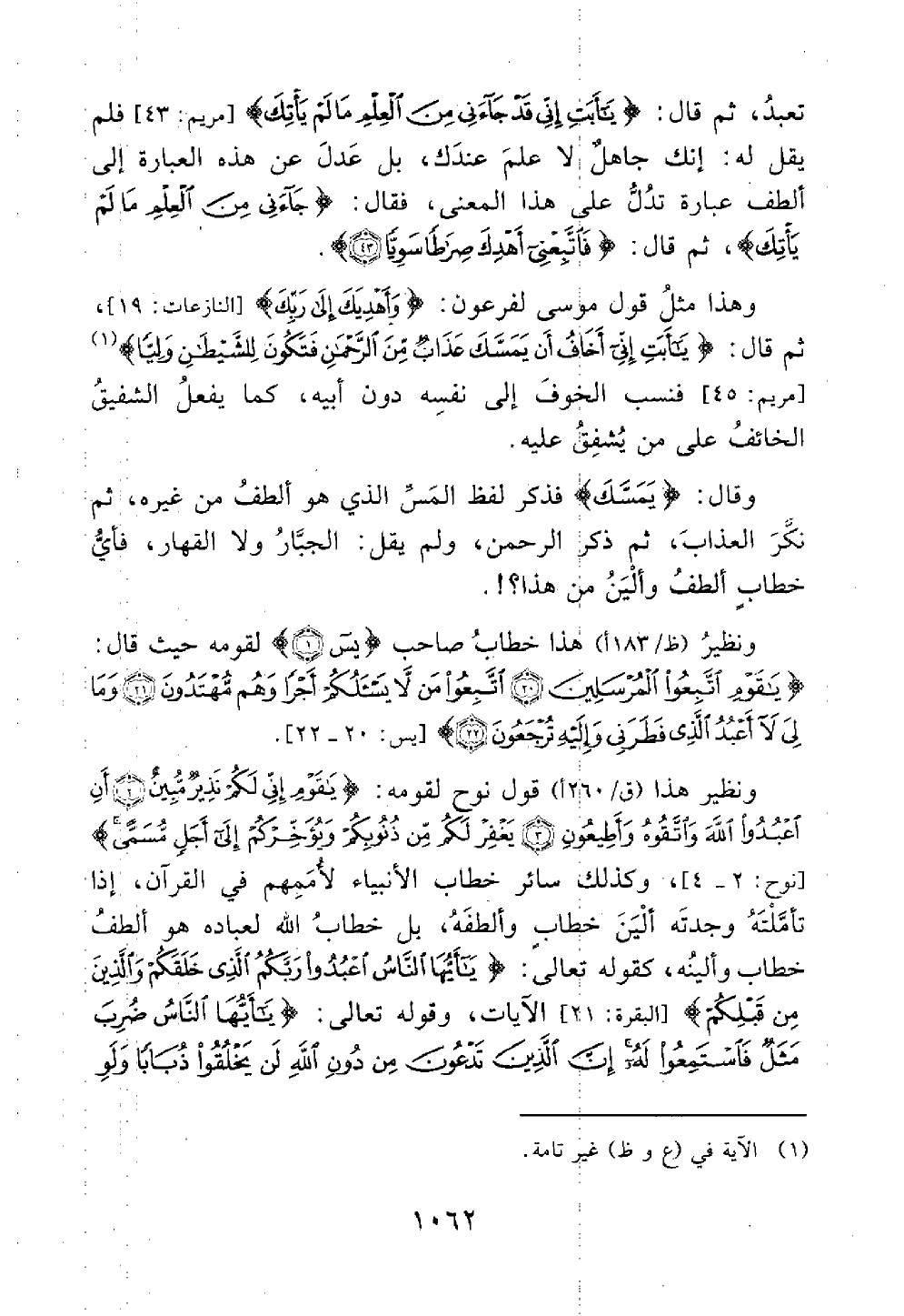ونظير ذلك قول نوح لقومه يا قوم إني لكم نذير مبين أن أعبدوا الله واتقوه وأطيعون يغفر لكم ذنوبكم ويؤخركم إلى أجل مسمى وكذلك سائر خطاب الأنبياء لأمتهم في القرآن إذا تأملته وجدته ألين خطاب وألطفه بل خطاب الله لعباده وألطف خطاب وألينه كقوله تعالى يا ايها الناس اعبدوا ربكم الذي خلقكم والذين من قبلكم الآيات وقوله تعالى يا أيها الناس ضرب مثل فاستمعوا له إن الذين تدعون من دون الله لن يخلقوا ذبابا ولو@