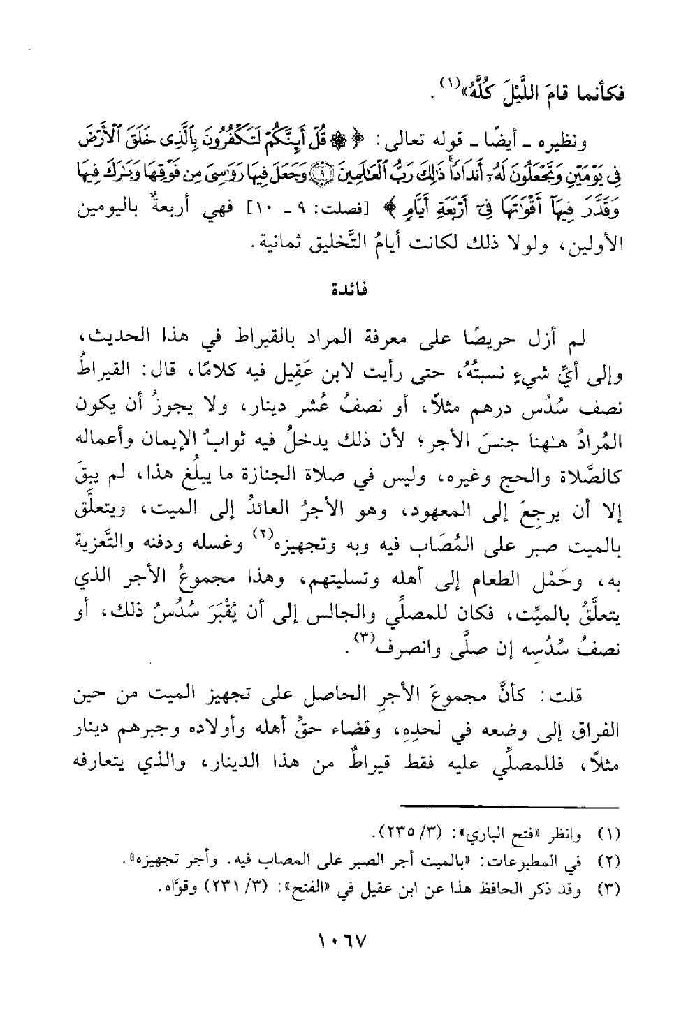 لم أزل حريصا على معرفة المراد بالقيراط في هذا الحديث وإلى أي شيء نسبته حتى رأيت لابن عقيل فيه كلاما قال القيراط نصف سدس درهم مثلا أو نصف دينار ولا يجوز أن يكون المراد هنا جنس الأجر لأن ذلك يدخل فيه ثواب الإيمان وأعماله كالصلاة والحج وغيره وليس في صلاة الجنازة ما يبلغ هذا فلم يبق إلا أن يرجع إلى المعهود وهو الأجر العائد إلى الميت ويتعلق بالميت أجر الصبر على المصاب فيه وأجر تجهيز وغسله ودفنه والتعزية به وحمل الطعام إلى أهله وتسليتهم وهذا مجموع الأجر الذي يتعلق بالميت فكان للمصلى والجالس إلى أن يقبر سدس ذلك أو نصف سدسه إن صلى وانصرف