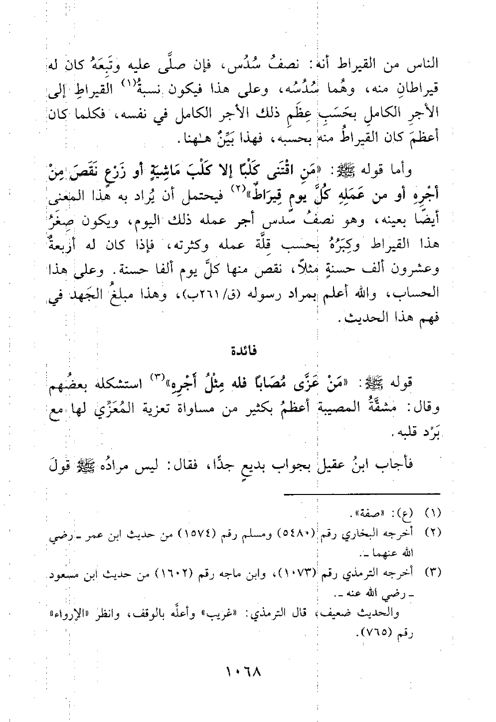 وأما قوله افتنى كلبا إلا كلب ماشية أو زرع نقص من أجره أو من عمله كل يوم قيراط فيحتمل أن يراد به هذا المعنى أيضا بعينه وهو نصف سدس أجر عمله ذلك اليوم ويكون صغر هذا القيراط وكبره بحسب قلة عمله وكثرته فإذا كانت له أربعة وعشرون ألف حسنة مثلا نقص منها كل يوم ألفا حسنة وعلى هذا الحساب والله أعلم بمراد رسوله وهذا مبلغ الجهد في فهم هذاالحديث فائدة تعزية المصاب قوله عزى مصابا فله مثل أجره // ضعيف // استكشله بعضهم وقال