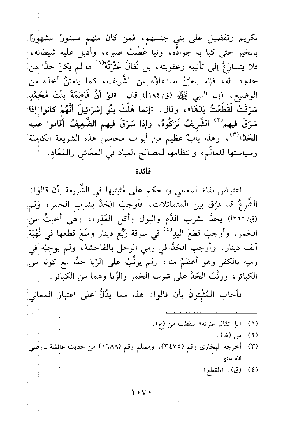 يدها وقال إنما هلك بنوا إسرائيل أنهم كانوا إذا سرق فيهم الشريف تركوه وإذا سرق فيهم الضعيف اقاموا عليه الحد // رواه البخاري ومسلم والترمذي والنسائي // وهذا باب عظيم من أبواب محاسن هذه الشريعة الكاملة وسياستها للعالم وانتظامها لمصالح العباد في المعاش والمعاد فائدة نفاة الحكم والمثبتون