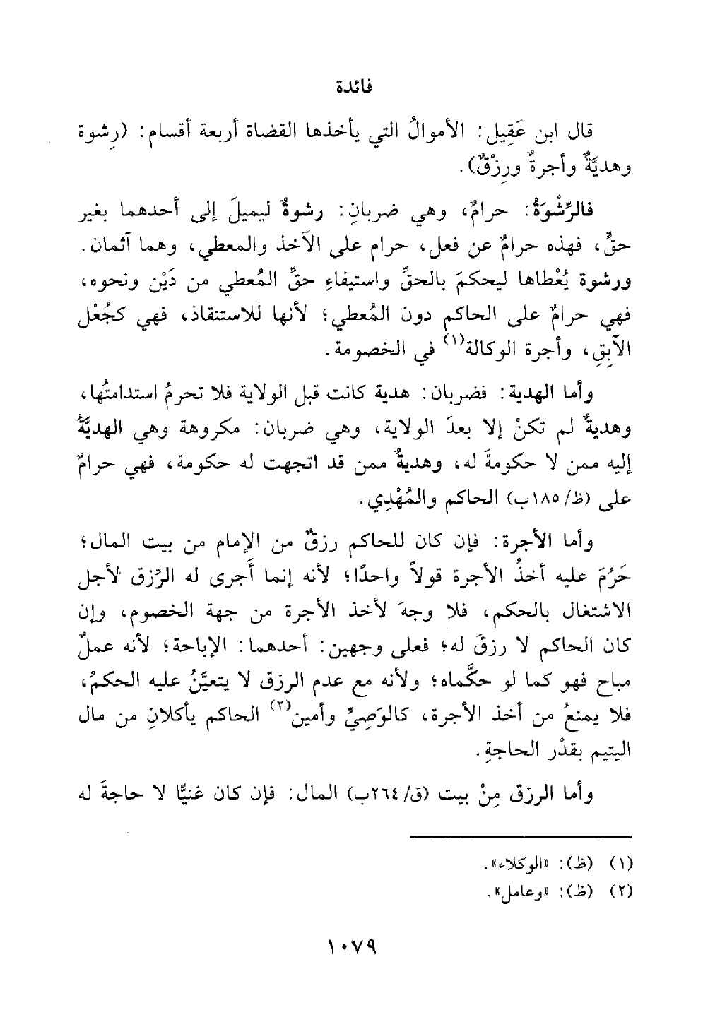 قال ابن عقيل الأموال التي يأخذها القضاة أربعة أقسام رشوة وهداية وأجرة ورزق الرشوة