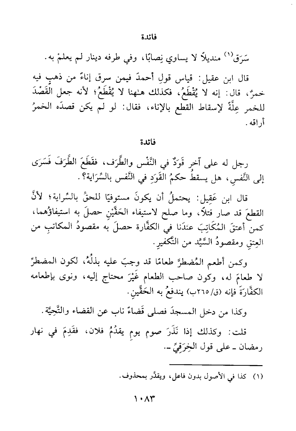 قال ابن عقيل قياس قول أحمد فيمن سرق إناء من ذهب فيه خمر قال إنه لا يقطع فكذلك ههنا لا يقطع لأنه جعل القصد للخمر علة لإسقاط القطع بالإناء فقال لو لم يكن قصده الخمر أراقه فائدة قود في النفس والطرف