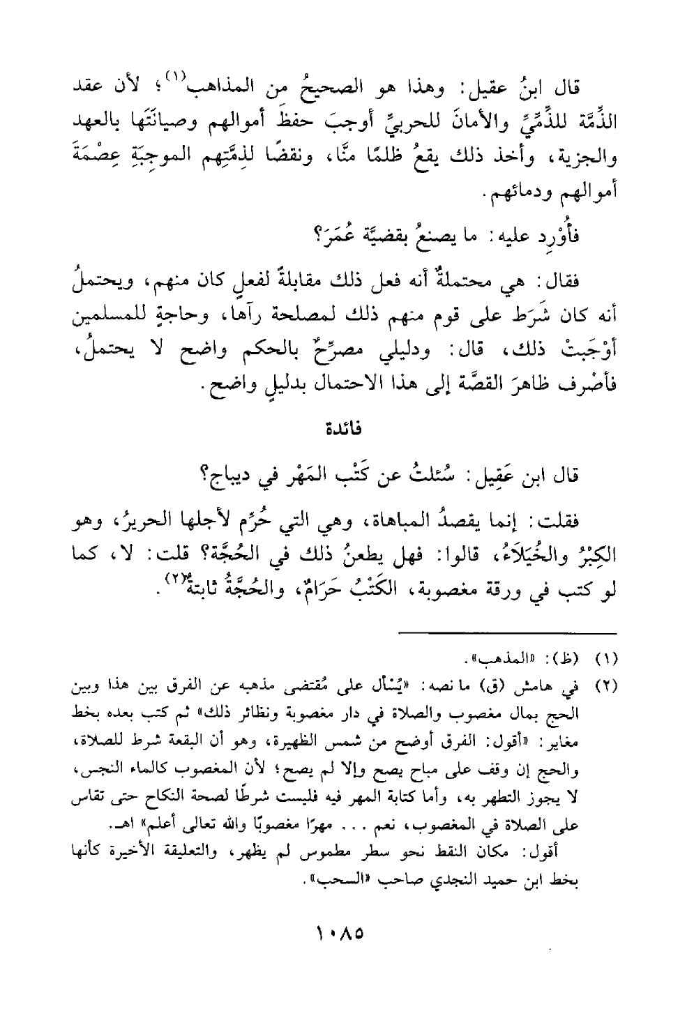 قال ابن عقيل وهذا هو الصحيح من المذهب لأن عقد الذمة للذمي والأمان للحربي أوجب حفظ أموالهم وصيانتها بالعهد والجزية وأخذ ذلك يقع ظلما منا ونقصا لذمتهم الموجبة عصمة أموالهم ودمائهم فأورد عليهم ما يصنع بقضية عمر فقال هي محتملة أنه فعل ذلك لفعل كان منهم ويحتمل انه كان شرط على قوم منهم ذلك لمصلحة رآها وحاجة للمسلمين أوجبت ذلك قال ودليلي مصرح بالحكم واضح لا يحتمل فاصرف ظاهر القصة إلى هذا الاحتمال بدليلي الواضح فائدة كتب المهر في ديباج