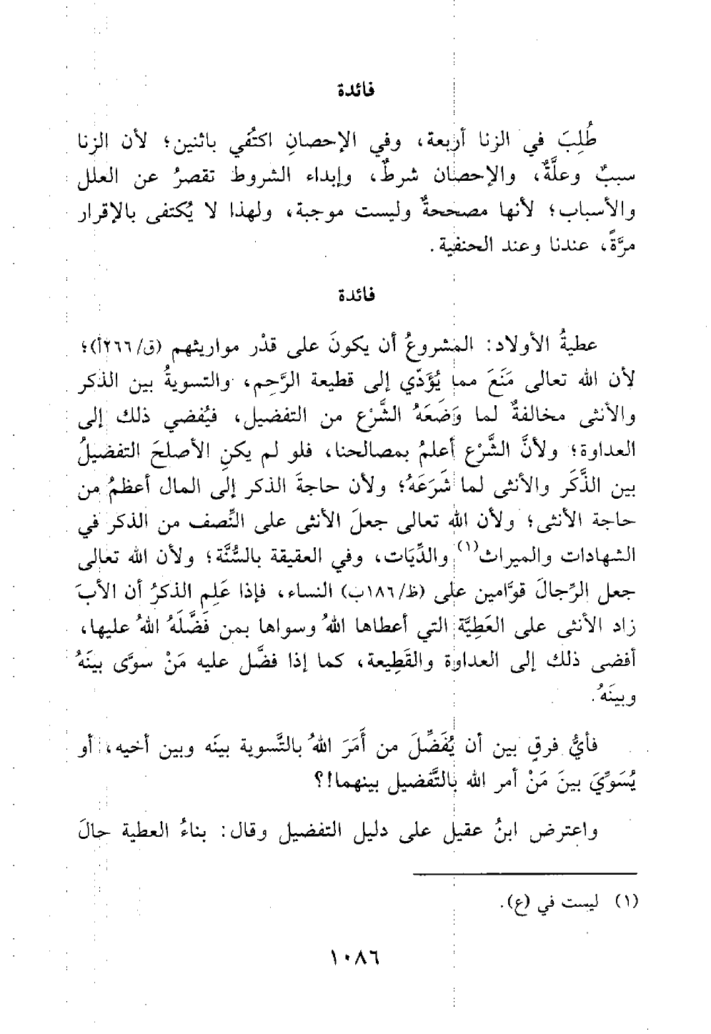 طلب في الزنا أربعة وفي الإحصان اكتفى بإثنين لان الزنا سبب وعلة والإحصان شرط وإبداء الشروط تقصر عن العلل والأسباب لأنها مصححة وليست موجبة ولهذا لا يكتفي بالإقرار مرة عندنا وعند الحنفة فائدة عطية الأولاد المشروعة