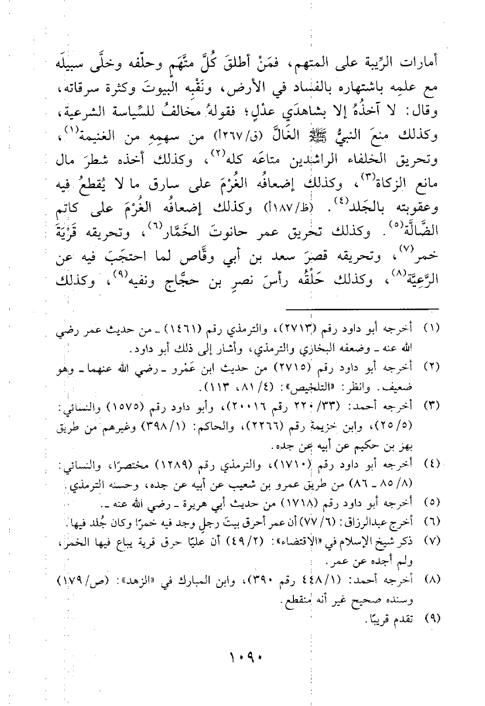 أمارات الريبه على المتهم فمن أطلق كل متهم وخلى سبيله مع علمه باشتهاره بالفساد في الأرض ونقبه البيوت وكثرة سرقاته وقال لا آخذه إلا بشاهدي عدل فقوله مخالف للسياسة الشرعية وكذلك منع النبي الغال من سهمه من الغنيمة // ضعيف مرفوعا // وتحريق الخلفاء الراشدين متاعه