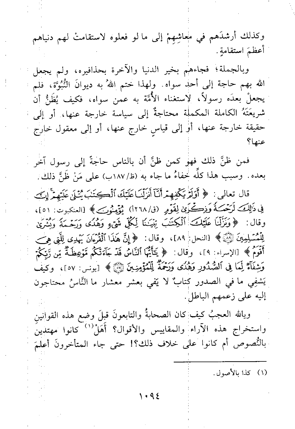 الكتاب تبيانا لكل شيء وهدى ورحمة وبشري للمسلمين وقال تعالى إن هذا القرآن يهدي للتي هي أقوم وقال تعالى يا أيها الناس قد جاءتكم موعظة من ربكم وشفاء لما في الصدور وهدي ورحمة للمؤمنين وكيف يشفى ما في الصدور كتاب لا يفي بعشر معشار ما الناس محتاجون إليه على زعمهم الباطل ويا لله العجب كيف كان الصحابة والتابعون قبل وضع هذه القوانين واستخراج هذه الآراء والمقايس والأقوال أهل كانوا مهتدين بالنصوص أم كانوا على خلاف ذلك حتى جاء المتأخرون أعلم @