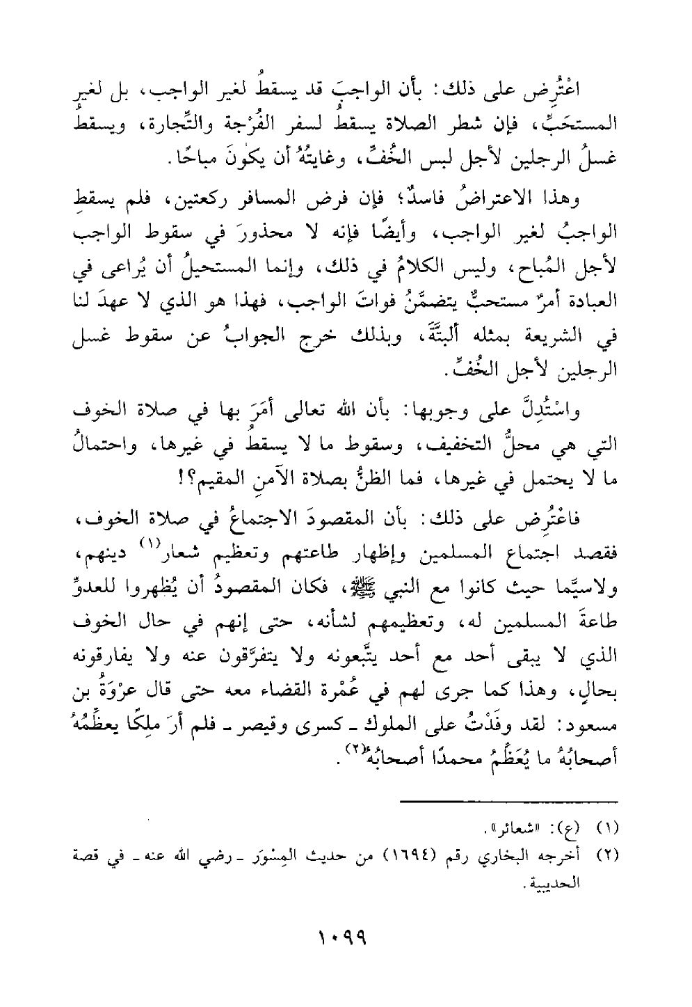 اعترض على ذلك بأن الواجب قد يسقط لغير الواجب بك لغير المستحب فإن شطر الصلاة يسقط لسفر الفرجة والتجارة ويسقط غسل الرجلين لأجل لبس الخف وغايته أن يكون مباحا وهذا الاعتراض فاسد فإن فرض المسافر ركعتين قلم يسقط الواجب لغير الواجب وأيضا فإنه لا محذور في سقوط الواجب لأجل المباح وليس الكلام في ذلك وإنما المستحيل أن يراعى في العبادة أمر مستحب يتضمن فوات الواجب فهذا هو الذي لا عهد لنا في الشريعة بمثله البتة وبذلك الجواب عن سقوط غسل الرجلين لأجل الخف واستدل على وجوبها بان الله تعالى أمر بها في صلاة الخوف التي هي محل التخفيف وسقوط ما لا يسقط في غيرها واحتمال ما لا يحتمل في غيرها فما الظن بصلاة الآمن المقيم