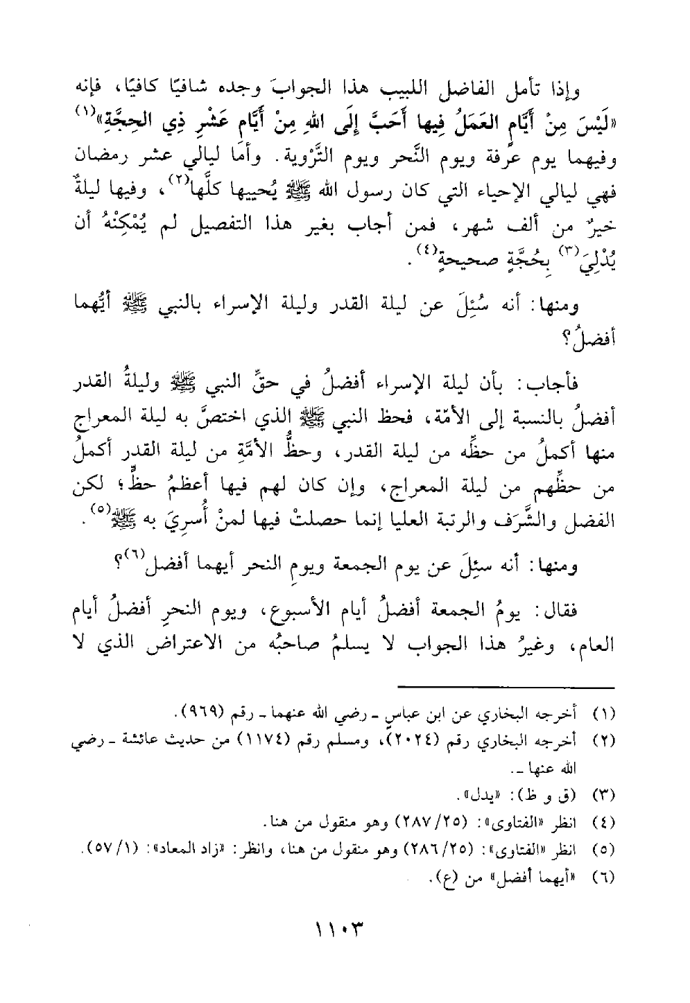 وإذا تأمل الفاضل اللبيب هذا الجواب وجده شافيا كافيا فإنه ليس من ايام العمل فيها أحب إلى الله من أيام عشر ذي الحجة وفيهما يوم عرفة ويوم النحر ويوم التروية وأما ليالي عشر رمضان فهي ليالي الاحياء التي كان رسول الله يحييها كلها وفيها ليلة خير من ألف شهر فمن أجاب بغير هذا التفصيل لم يمكنه أن يدلي بحجة صحيحة