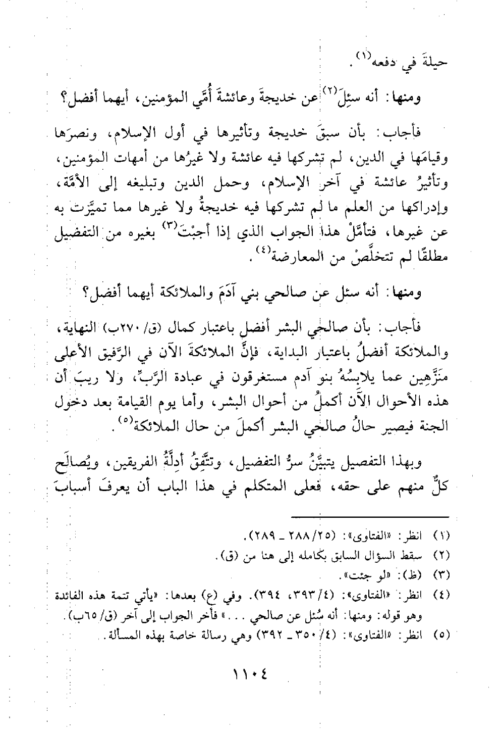 ومنها أنه سئل عن خديجة وعائشة أمي المؤمنين ايهما أفضل فأجاب بأن سبق خديجة وتأثيرها في أول الإسلام ونصرها وقيامها في الدين لم تشركها فيه عائشة ولا غيرها من امهات المؤمنين وتأثير عائشة في آخر الإسلام وحمل الدين وتبليغه إلى الأمة وإدراكها من العلم ما لم تشركها فيه خديجة ولا غيرها مما تميزت به غيرها فتأمل هذا الجواب الذي لو جئت بغيره من التفضيل مطلقا لم تخلص من المعارضة