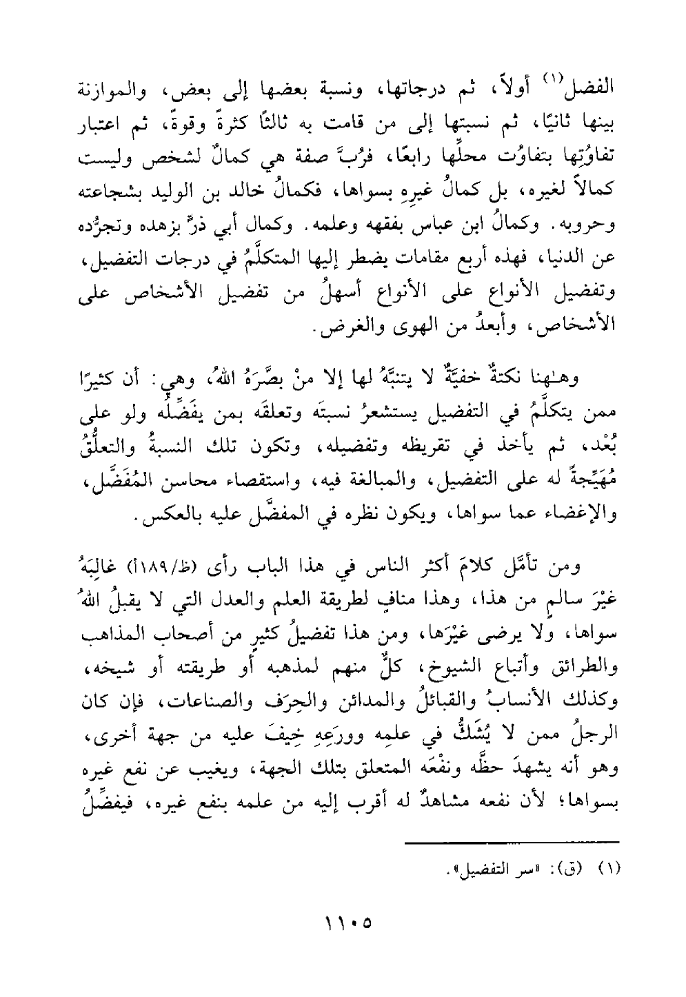 وههنا نكتة خفية لا ينتبه لها إلا من بصره الله وهي أن كثيرا ممن يتكلم في التفضيل يستشعر نسيته وتعلقه بمن يفضله ولو على بعد ثم يأخذ في تقريظه وتفضيله وتكون تلك النسبة والتعلق مهيجة له على التفضيل والمبالغة فيه واستقصاء محاسن المفضل والإعضاء عما سواها ويكون نظره في المفضل عليه بالعكس