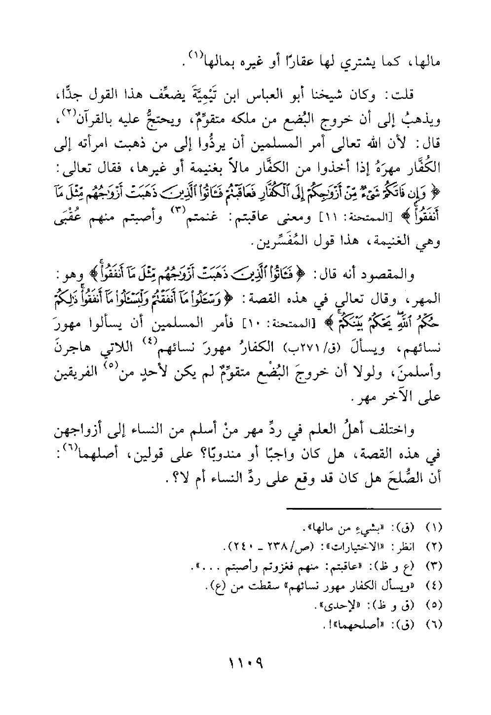 قلت وكان شيخنا أبو العباس بن تيمية رحمه الله ورضي عنه يضعف هذا القول جدا ويذهب إلى خروج البضع من ملكه متقوم ويحتج عليه بالقرآن قال لأن الله تعالى أمر المسلمين أن يردوا إلى من ذهبت امرأته إلى الكفار مهره إذا أخذوا من الكفار مالا بغنيمة أو غيرها فقال تعالى وإن فاتكم شيء من أزواجكم إلى الكفار فعاقبتم فآتوا الذين ذهبت أزواجهم مثل ما أنفقوا ومعنى عاقبتم أصبتم منهم عقبى وهي الغنيمة هذا قول المفسرين والمقصود أنه قال فآتوا الذين ذهبت أزواجهم مثل ما أنفقوا وهو المهر وقال تعالى في هذه القصة واسألوا ما أنفقتم وليسألوا ما أنفقوا ذلكم حكم الله يحكم بينكم فأمر المسلمين أن يسألوا مهور نسائهم ويسأل الكفار مهور نسائهم اللاتي هاجرن وأسلمن ولو لا أن خروج البضع متقوم لم يكن لأحد الفريقين على الآخر مهرا واختلف أهل العلم في رد مهر من أسلم من النساء إلى أزواجهن في هذه القصة هل كان واجبا او مندوبا على قولين أصلهما أن الصلح هل كان قد وقع على رد النساء أم لا@