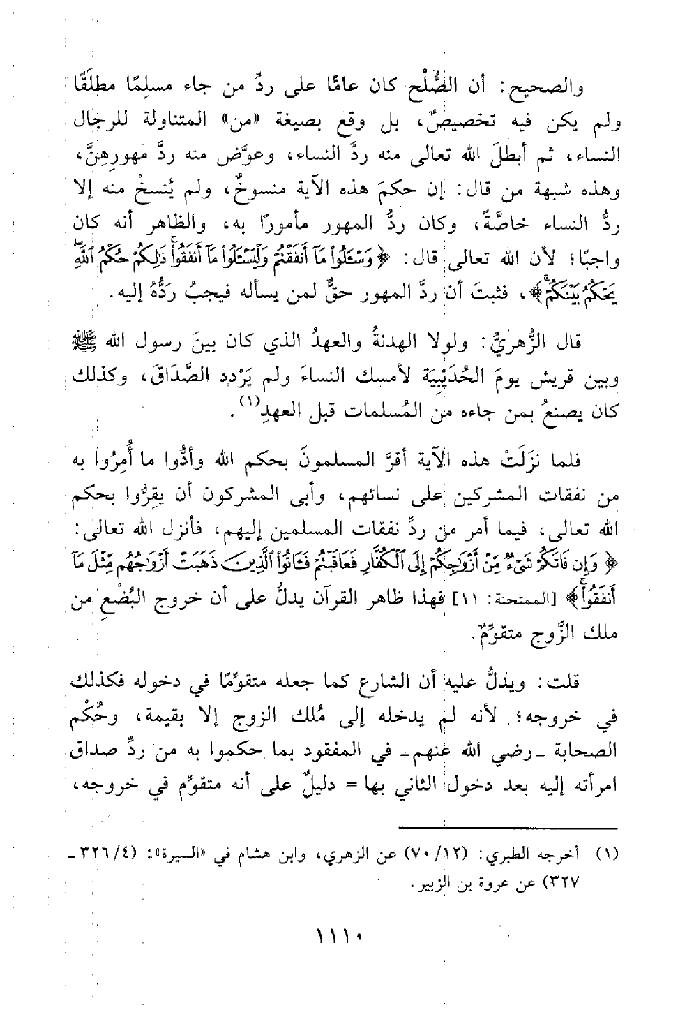والصحيح أن الصلح كان عاما على رد من جاء مسلما مطلقا ولم يكن فيه تخصيص بل وقع بصيغة من المتناولة للرجال والنساء ثم أبطل الله تعالى منه رد النساء وعوض منه رد مهورهن وهذه شبهة من قال إن حكم هذه الآية منسوخ ولم ينسخ منه إلا رد النساء خاصة وكان رد المهور مأمورا به والظاهر أنه كان واجبا لأن الله تعالى قال واسألوا ما أنفقتم وليسألوا ما أنفقوا ذلكم حكم الله يحكم بينكم فثبت أن رد المهور حق لمن يسأله فيجب رده إليه