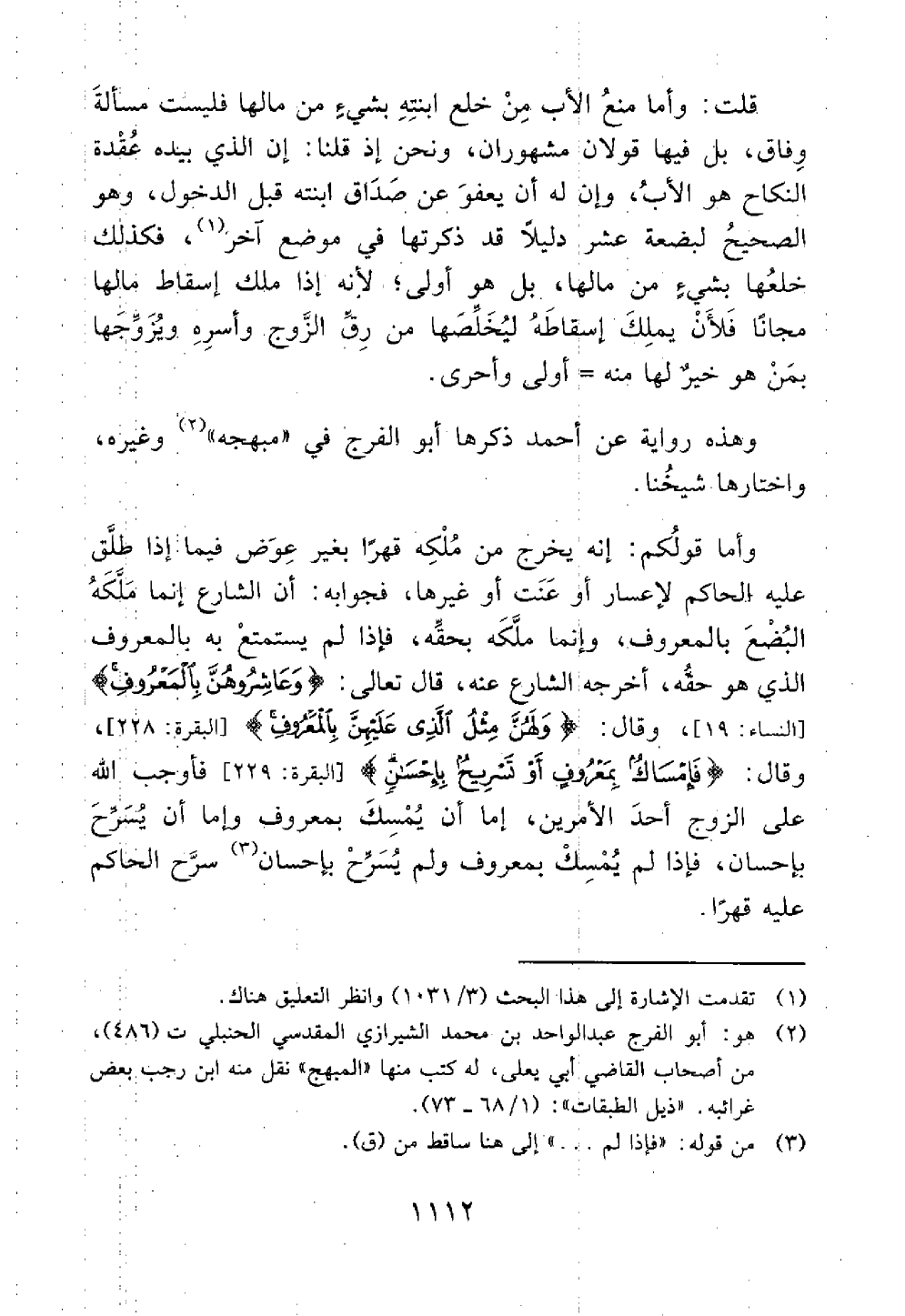 وهذه رواية عن أحمد ذكرها أبو الفرج في مبهجه وغيره واختاره شيخنا وأما قولكم إنه يخرج من ملكه قهرا بغير عوض فيما إذا طلق عليه الحاكم لإعسار أو عنت أو غيرها فجوابه أن الشارع إنما ملكه البضع بالمعروف وأنما ملكه بحقه فإذا لم يستمتع به بالمعروف الذي هو حقه أخرجه الشارع عنه قال تعالى وعاشروهن بالمعروف وقال ولهن ! مثل الذي عليهن بالمعروف