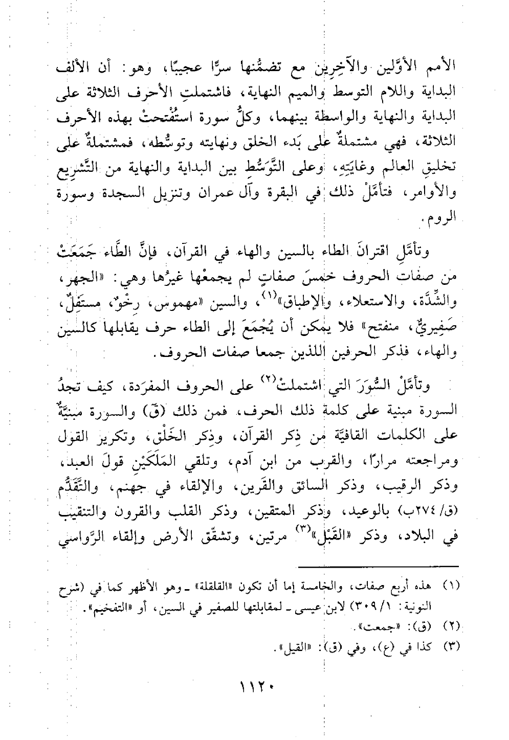 وتأمل اقتران الطاء بالسين والهاء في القرآن فإن الطاء جمعت من صفات الحروف خمس صفات لم يجمعها غيرها وهي الجهر والشدة والاستعلاء والإطباق والسين مهموس رخو مستفل صفيري منفتح فلا يمكن أن يجمع إلى الطاء حرف يقابلها كالسين والهاء فذكر الحرفين اللذين جمعا صفات الحروف وتأمل السور التي اشتملت على الحروف المفردة كيف تجد السورة مبنية على كلمة ذلك الحرف فمن ذلك ق والسورة مبنية على الكلمات القافية من ذكر القرآن وذكر الخلق وتكرير القول ومراجعته مرارا والقرب من ابن آدم وتلقي الملكين قول العبد وذكر الرقيب وذكر السائق والقرين والإلقاء في جهنم والتقدم بالوعيد وذكر المتقين وذكر القلب والقرون والتنقيب في البلاد وذكر القبل مرتين وتشقق الأرض وإلقاء الرواسي@