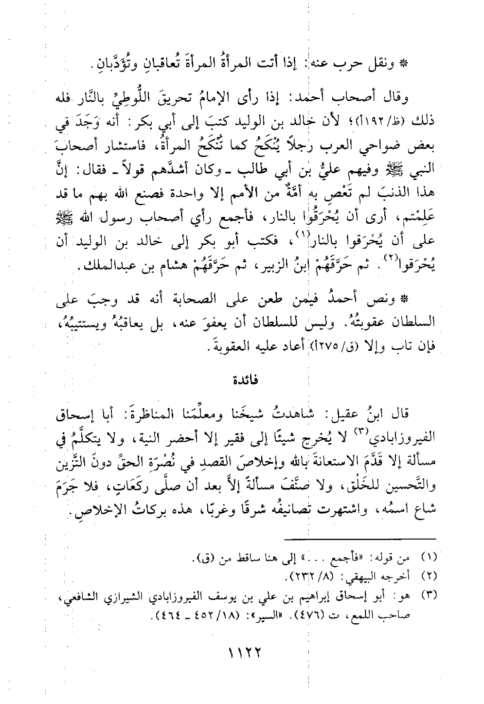 وقال أصحاب أحمد إذا راى الإمام تحريق اللوطي بالنار فله ذلك إذا رأى لأن خالد ابن الوليد كتب إلى أبي بكر أنه وجد في بعض ضواحي العرب رجلا ينكح كما تنكح المرأة فاستشار أصحاب النبي علي بن أبي طالب وكان أشدهم قولا فقال إن هذا الذنب لم تعص به إمة من الأمم إلا واحدة فصنع الله بهم ما قد علمتهم أرى أن يحرقوا بالنار فأجمع رأي أصحاب رسول الله على أن يحرقوا بالنار فكتب أبو بكر إلى خالد بن الوليد أن يحرقوا ثم حرقهم ابن الزبير ثم حرقهم هشام بن عبد الملك ونص أحمد فيمن طعن في الصحابة على أنه قد وجب على السلطان عقوبته وليس للسلطان أن يعفوا عنه بل يعاقبه ويستتيبه فإن تاب وإلا أعاد عليه العقوبة فائدة الإخلاص في العمل