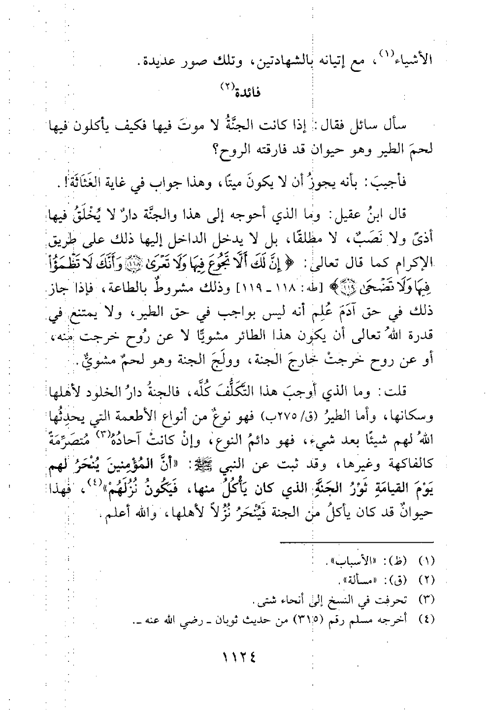 سأل سائل فقال إذا كانت الجنة لا موت فيها فكيف يأكلون فيها لحم الطير وهو حيوان قد فارقته الروح فأجيب بأنه يجوز أن لا يكون ميتا وهذا جواب في غايه الغثاثة قال ابن عقيل وما الذي احوجه إلى هذا والجنة دار لا يخلق فيها أذى ولا نصب لا مطلقا بل لا يدخل الدخل إليها ذلك على طريق الإكرام كما قال تعالى إن لك ألا تجوع فيها ولا تعرى وأنك لا تظمؤا فيها ولا تضحى وذلك مشروط بالطاعة فإذا جاز ذلك في حق آدم علم أنه ليس بواجب في حق الطير ولا يمتنع في قدرة الله تعالى أن يكون هذا الطائر مشوبا لا عن روح خرجت منه أو عن روح خرجت خارج الجنة وولج الجنة وهو لحم مشوي