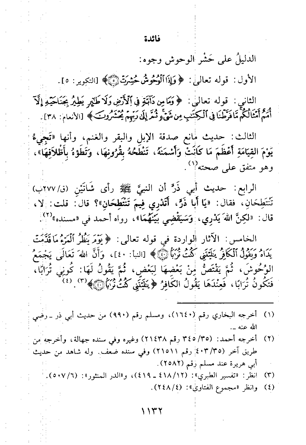 الرابع حديث أبي ذر الغفاري رضي الله عنه أن النبي شاتين ينتطحان فقال يا ابا ذر اتدري فيم نيتطحان قال قلت لا قال لكن الله يدري وسيقضي بينهما // صحيح // رواه أحمد بن حنبل رضي الله عنه في مسنده