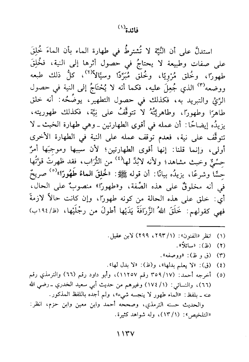 استدل على أن النية لا تشترط في طهارة الماء بأن الماء خلق على صفات وطبيعة لا يحتاج في حصول أثرها إلى النية وخلق طهورا وخلق مرويا وخلق مبردا سائلا كل ذلك طبعه ووصفه الذي جعل عليه فكما أنه لا يحتاج إلى النية في حصول الري والتبريد به فكذلك في حصول التطهير يوضحه أنه خلق طاهرا أو طهورا وطاهريته لا تتوقف على نية فكذلك طهوريته يزيده إيضاحا أن عمله في أقوى الطهارتين وهي طهارة الخبث لا تتوقف على نية فعدم توقف عمله علي النية في الطهارة الأخرى أولى وإنما قلنا إنها أقوى الطهارتين لأن سببها وموجبها أمر حسي وخبث مشاهد ولأنه لا بدل لها من التراب فقد ظهرت قوتها حسا وشرعا يزيده بيانا قوله خلق الماء طهورا // صحيح المعنى // صريح في أنه مخلوق على هذه الصفة وطهورا منصوب على الحال أي خلق على هذه الحالة من كونه طهورا وإن كانت حالا لازمة فهي كقولهم خلق الله الزراقه يديها أطول من رجليها@