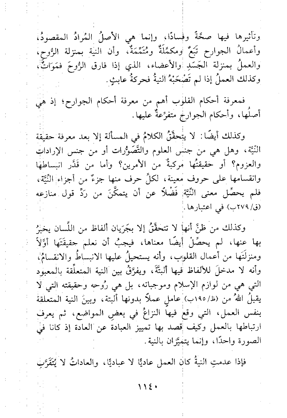 وكذلك أيضا لا يتحقق الكلام في المسألة إلا بعد معرفة حقيقة النية وهل هي من جنس المعلوم والتصورات أو من جنس الإرادات والعزوم أو حقيقتها مركبة من الأمرين وأما من قبيل انبساطها وانقسامها على حروف معينة لكل حرف منها جزء من أجزاء النية فلم يحصل معنى النية فضلا عن ان يتمكن من رد قول منازعه في اعتبارها